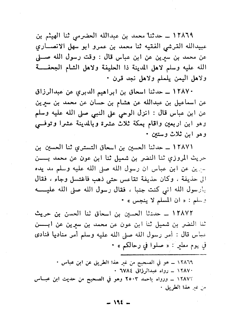 12871 - حَدَّثَنَا الْحُسَيْنُ بْنُ إِسْحَاقَ التُّسْتَرِيُّ، ثنا الْحُسَيْنُ بْنُ حُرَيْثٍ الْمَرْوَزِيُّ، ثنا النَّضْرُ بْنُ شُمَيْلٍ، ثنا ابْنُ عَوْنٍ، عَنْ مُحَمَّدِ بْنِ سِيرِينَ، عَنِ ابْنِ عَبَّاسٍ أَنَّ رَسُولَ اللهِ صَلَّى اللهُ عَلَيْهِ وَسَلَّمَ: مَدَّ يَدَهُ إِلَى حُذَيْفَةَ وَكَانَ حُذَيْفَةُ تَقَاعَسَ حَتَّى ذَهَبَ فَاغْتَسَلَ، وَجَاءَ , فَقَالَ: يَا رَسُولَ اللهِ , إِنِّي كُنْتُ جُنُبًا، فَقَالَ رَسُولُ اللهِ صَلَّى اللهُ عَلَيْهِ وَسَلَّمَ: «إِنَّ §الْمُسْلِمَ لَا يَنْجُسُ»