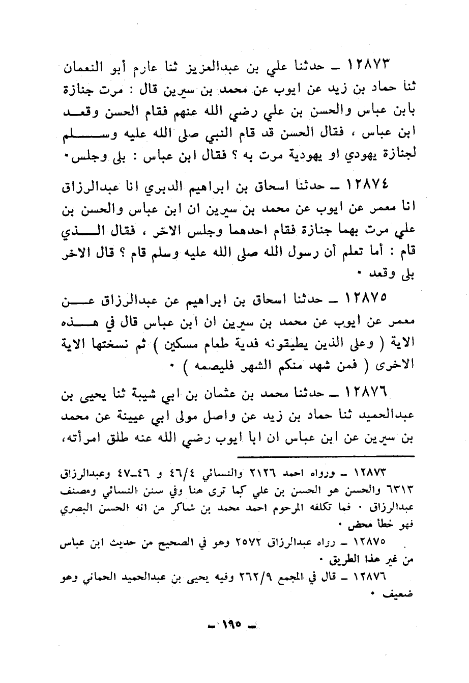 12873 - حَدَّثَنَا عَلِيُّ بْنُ عَبْدِ الْعَزِيزِ، ثنا عَارِمٌ أَبُو النُّعْمَانِ، ثنا حَمَّادُ بْنُ زَيْدٍ، عَنْ أَيُّوبَ، عَنْ مُحَمَّدِ بْنِ سِيرِينَ، قَالَ: مَرَّتْ جِنَازَةٌ بِابْنِ عَبَّاسٍ، وَالْحَسَنِ بْنِ عَلِيٍّ رَضِيَ اللهُ عَنْهُمْ: فَقَامَ الْحَسَنُ، وَقَعَدَ ابْنُ عَبَّاسٍ، فَقَالَ الْحَسَنُ: " أَلَيْسَ قَدْ §قَامَ النَّبِيُّ صَلَّى اللهُ عَلَيْهِ وَسَلَّمَ، لِجِنَازَةِ يَهُودِيٍّ أَوْ يَهُودِيَّةٍ مَرَّتْ بِهِ؟ فَقَالَ ابْنُ عَبَّاسً: بَلَى، وَجَلَسَ "