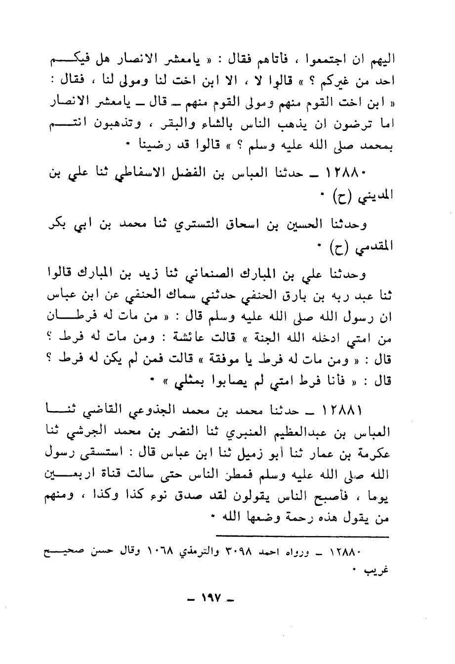 12880 - حَدَّثَنَا الْعَبَّاسُ بْنُ الْفَضْلِ الْأَسْفَاطِيُّ، ثنا عَلِيُّ بْنُ الْمَدِينِيِّ، ح وَحَدَّثَنَا الْحُسَيْنُ بْنُ إِسْحَاقَ التُّسْتَرِيُّ، ثنا مُحَمَّدُ بْنُ أَبِي بَكْرٍ الْمُقَدَّمِيُّ، ح وَحَدَّثَنَا عَلِيُّ بْنُ الْمُبَارَكِ الصَّنْعَانِيُّ، ثنا زَيْدُ بْنُ الْمُبَارَكِ، قَالُوا: ثنا عَبْدُ رَبِّهِ بْنُ بَارِقٍ الْحَنَفِيُّ، حَدَّثَنِي سِمَاكٌ الْحَنَفِيُّ، عَنِ ابْنِ عَبَّاسٍ أَنَّ رَسُولَ اللهِ صَلَّى اللهُ عَلَيْهِ وَسَلَّمَ قَالَ: «§مَنْ مَاتَ لَهُ فَرَطَانِ مِنْ أُمَّتِي أَدْخَلَهُ اللهُ الْجَنَّةَ» ، قَالَتْ عَائِشَةُ: وَمَنْ مَاتْ لَهُ فَرَطٌ؟ قَالَ: «وَمَنْ مَاتَ لَهُ فَرَطٌ يَا مُوَفَّقَةُ» ، قَالَتْ: فَمَنْ لَمْ يَكُنْ لَهُ فَرَطٌ؟ قَالَ: «فَأَنَا فَرَطُ أُمَّتِي لَمْ يُصَابُوا بِمِثْلِي»