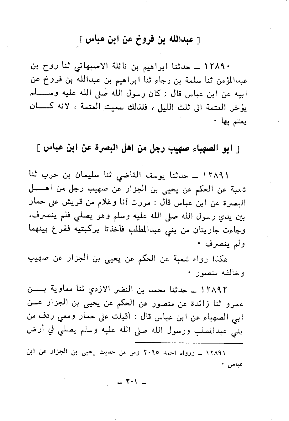 12892 - حَدَّثَنَا مُحَمَّدُ بْنُ النَّضْرِ الْأَزْدِيُّ، ثنا مُعَاوِيَةُ بْنُ عَمْرٍو، ثنا زَائِدَةُ، عَنْ مَنْصُورٍ، عَنِ الْحَكَمِ، عَنْ يَحْيَى بْنِ الْجَزَّارِ، عَنْ أَبِي الصَّهْبَاءِ، عَنِ ابْنِ عَبَّاسٍ، قَالَ: «§أَقْبَلْتُ عَلَى حِمَارٍ، وَمَعِي رِدْفٌ مِنْ بَنِي عَبْدِ الْمُطَّلِبِ، وَرَسُولُ اللهِ صَلَّى اللهُ عَلَيْهِ وَسَلَّمَ يُصَلِّي فِي أَرْضٍ خَلَاءٍ فَنَزَلْنَا، ثُمَّ جِئْنَا حَتَّى دَخَلْنَا فِي الصَّلَاةِ، وَتَرَكْنَا الْحِمَارَ قُدَّامَهُمْ فَمَا بَالَى ذَلِكَ، وَأَقْبَلَتْ جَارِيَتَانِ مِنْ بَنِي عَبْدِ الْمُطَّلِبِ يَشَتَدَّانِ يَتْبَعُ إِحْدَاهُمَا الْأُخْرَى حَتَّى انْتَهَتَا إِلَى النَّبِيِّ صَلَّى اللهُ عَلَيْهِ وَسَلَّمَ فِي الصَّلَاةِ وَهُوَ يُصَلِّي , فَفَرَّقَ بَيْنَهُمَا فَمَا بَالَى ذَلِكَ»