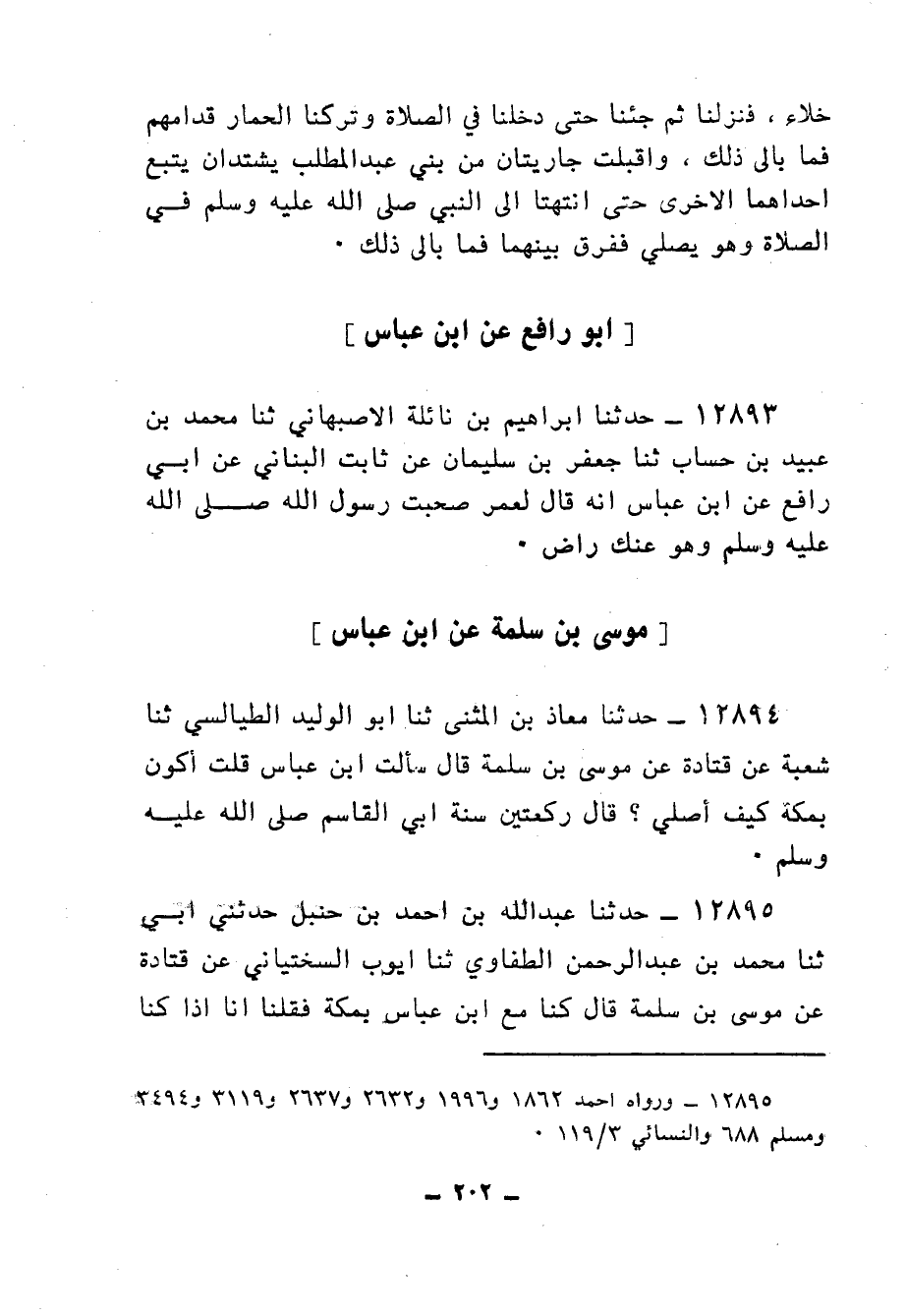 12895 - حَدَّثَنَا عَبْدُ اللهِ بْنُ أَحْمَدَ بْنِ حَنْبَلٍ، حَدَّثَنِي أَبِي، ثنا مُحَمَّدُ بْنُ عَبْدِ الرَّحْمَنِ الطُّفَاوِيُّ، ثنا أَيُّوبُ السِّخْتِيَانِيُّ، عَنْ قَتَادَةَ، عَنْ مُوسَى بْنِ سَلَمَةَ، قَالَ: كُنَّا مَعَ ابْنِ عَبَّاسٍ بِمَكَّةَ فَقُلْنَا: إِنَّا إِذَا كُنَّا مَعَكُمْ صَلَّيْنَا أَرْبَعًا، فَإِذَا رَجَعْنَا إِلَى رِحَالِنَا صَلَّيْنَا رَكْعَتَيْنِ، فَقَالَ: «§تِلْكَ سُنَّةُ أَبِي الْقَاسِمِ صَلَّى اللهُ عَلَيْهِ وَسَلَّمَ، وَإِنْ رَغِمْتُمْ»