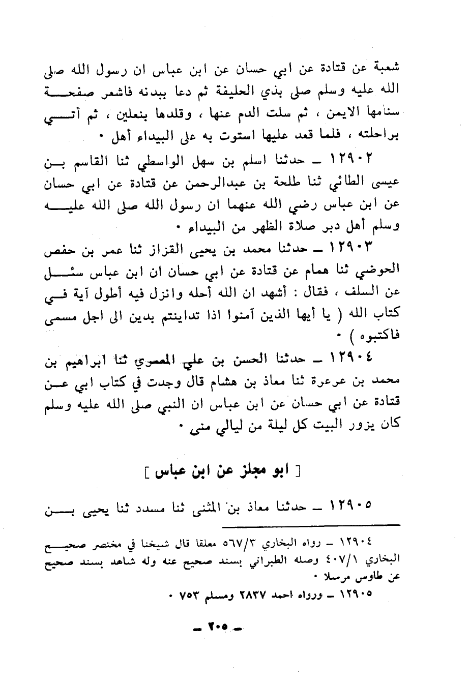 12904 - حَدَّثَنَا الْحَسَنُ بْنُ عَلِيٍّ الْمَعْمَرِيُّ، ثنا إِبْرَاهِيمُ بْنُ مُحَمَّدِ بْنِ عَرْعَرَةَ، ثنا مُعَاذُ بْنُ هِشَامٍ، قَالَ: وَجَدْتُ فِي كِتَابِ أَبِي عَنْ قَتَادَةَ، عَنْ أَبِي حَسَّانَ، عَنِ ابْنِ عَبَّاسٍ أَنَّ النَّبِيَّ صَلَّى اللهُ عَلَيْهِ وَسَلَّمَ: «كَانَ §يَزُورُ الْبَيْتَ كُلَّ لَيْلَةٍ مِنْ لَيَالِي مِنًى»