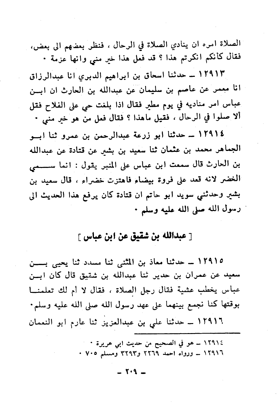 12915 - حَدَّثَنَا مُعَاذُ بْنُ الْمُثَنَّى، ثنا مُسَدَّدٌ، ثنا يَحْيَى بْنُ سَعِيدٍ، عَنْ عِمْرَانَ بْنِ حُدَيْرٍ، ثنا عَبْدُ اللهِ بْنُ شَقِيقٍ قَالَ: كَانَ ابْنُ عَبَّاسٍ يَخْطُبُ عَشِيَّةً فَقَالَ رَجُلٌ: الصَّلَاةَ، فَقَالَ: «§لَا أُمَّ لَكَ تُعْلِمُنَا بِوَقْتِهَا كُنَّا نَجْمَعُ بَيْنَهُمَا عَلَى عَهْدِ رَسُولِ اللهِ صَلَّى اللهُ عَلَيْهِ وَسَلَّمَ»