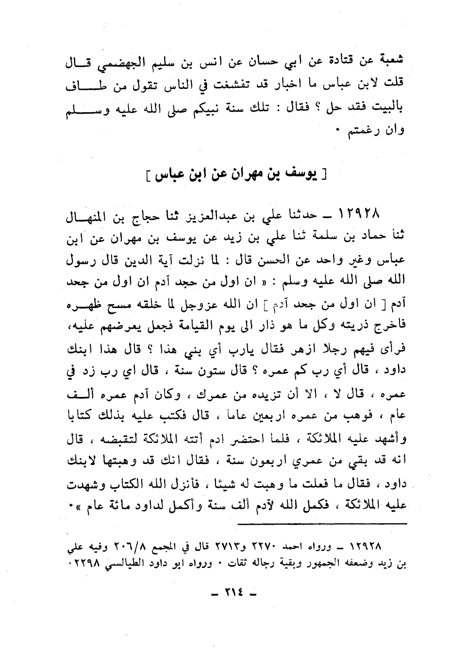 12928 - حَدَّثَنَا عَلِيُّ بْنُ عَبْدِ الْعَزِيزِ، ثنا حَجَّاجُ بْنُ الْمِنْهَالِ، ثنا حَمَّادُ بْنُ سَلَمَةَ، عَنْ عَلِيِّ بْنِ زَيْدٍ، عَنْ يُوسُفَ بْنِ مِهْرَانَ، عَنِ ابْنِ عَبَّاسٍ وَغَيْرِ وَاحِدٍ، عَنِ الْحَسَنِ، قَالَ: لَمَّا نَزَلَتْ آيَةُ الدِّينِ، قَالَ رَسُولُ اللهِ صَلَّى اللهُ عَلَيْهِ وَسَلَّمَ: " إِنَّ أَوَّلَ مَنْ جَحَدَ آدَمُ، إِنَّ اللهَ عَزَّ وَجَلَّ لَمَّا خَلَقَهُ مَسَحَ ظَهْرَهُ , فَأَخْرَجَ ذُرِّيَّتَهُ، وَكُلَّ مَا هُوَ ذَارِئٍ إِلَى يَوْمِ الْقِيَامَةِ , فَجَعَلَ يَعْرِضُهُمْ عَلَيْهِ، فَرَأَى فِيهِمْ رَجُلًا أَزْهَرَ , فَقَالَ: يَا رَبِّ , أَيُّ بَنِيَّ هَذَا؟ قَالَ: §هَذَا ابْنُكَ دَاوُدُ، قَالَ: أَيْ رَبِّ , كَمْ عُمْرُهُ؟ قَالَ: سِتُّونَ سَنَةً، قَالَ: أَيْ رَبِّ , زِدْ فِي عُمْرِهِ، قَالَ: لَا إِلَّا أَنْ تَزِيدَهُ مِنْ عُمْرِكَ، وَكَانَ آدَمُ عُمْرُهُ أَلْفَ عَامٍ فَوَهَبَ مِنْ عُمْرِهِ أَرْبَعِينَ عَامًا، قَالَ: فَكَتَبَ عَلَيْهِ بِذَلِكَ كِتَابًا، وَأَشْهَدَ عَلَيْهِ الْمَلَائِكَةَ، فَلَمَّا احْتُضِرَ آدَمُ أَتَتْهُ الْمَلَائِكَةُ لِتَقْبِضَهُ، قَالَ: إِنَّهُ قَدْ بَقِيَ مِنْ عُمْرِي أَرْبَعُونَ سَنَةً، فَقَالَ: إِنَّكَ قَدْ وَهَبْتَهَا لِابْنِكَ دَاوُدَ، فَقَالَ: مَا فَعَلْتُ مَا وَهَبْتُ لَهُ شَيْئًا، فَأَنْزَلَ اللهُ الْكِتَابَ، وَشَهِدَتْ عَلَيْهِ الْمَلَائِكَةُ، فَكَمَّلُ اللهُ لِآدَمَ أَلْفَ سَنَةٍ، وَأَكْمَلَ لِدَاوُدَ مِائَةَ عَامٍ "