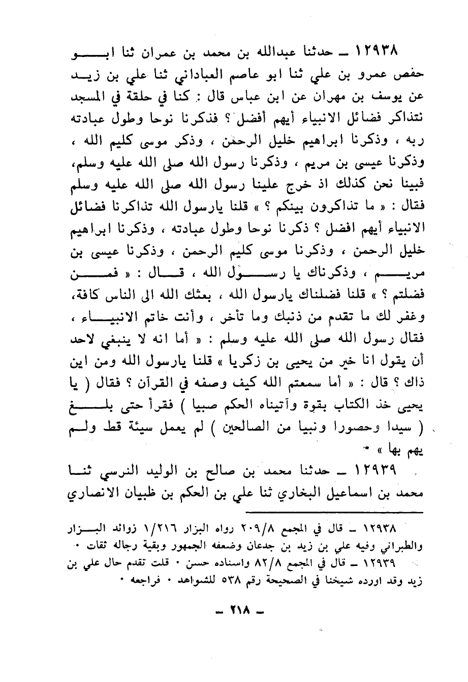 12938 - حَدَّثَنَا عَبْدُ اللهِ بْنُ مُحَمَّدِ بْنِ عِمْرَانَ، ثنا أَبُو حَفْصٍ عَمْرُو بْنُ عَلِيٍّ، ثنا أَبُو عَاصِمٍ الْعَبَّادَانِيُّ، ثنا عَلِيُّ بْنُ زَيْدٍ، عَنْ يُوسُفَ بْنِ مِهْرَانَ، عَنِ ابْنِ عَبَّاسٍ، قَالَ: كُنَّا فِي حَلْقَةٍ فِي الْمَسْجِدِ نَتَذَاكَرُ فَضَائِلَ الْأَنْبِيَاءِ , أَيُّهُمْ أَفْضَلُ؟ فَذَكَرْنَا نُوحًا وَطُولَ عِبَادَتِهِ رَبَّهُ، وَذَكَرْنَا إِبْرَاهِيمَ خَلِيلَ الرَّحْمَنِ، وَذَكَرْنَا مُوسَى كَلِيمَ اللهِ، وَذَكَرْنَا عِيسَى ابْنَ مَرْيَمَ، وَذَكَرْنَا رَسُولَ اللهِ صَلَّى اللهُ عَلَيْهِ وَسَلَّمَ، فَبَيْنَا نَحْنُ كَذَلِكَ إِذْ خَرَجَ عَلَيْنَا رَسُولُ اللهِ صَلَّى اللهُ عَلَيْهِ وَسَلَّمَ , فَقَالَ: «مَا تَذْكُرُونَ بَيْنَكُمْ؟» قُلْنَا: يَا رَسُولَ اللهُ , تَذَاكَرْنَا فَضَائِلَ الْأَنْبِيَاءِ , أَيُّهُمْ أَفْضَلُ؟ ذَكَرْنَا نُوحًا وَطُولَ عِبَادَتِهِ، وَذَكَرْنَا إِبْرَاهِيمَ خَلِيلَ الرَّحْمَنِ، وَذَكَرْنَا مُوسَى كَلِيمَ الرَّحْمَنِ، وَذَكَرْنَا عِيسَى ابْنَ مَرْيَمَ، وَذَكَرْنَاكَ يَا رَسُولَ اللهِ، قَالَ: فَمَنْ فَضَّلْتُمْ؟، قُلْنَا فَضَلَّنَاكَ يَا رَسُولَ اللهِ، بَعَثَكَ اللهُ إِلَى النَّاسِ كَافَّةً، وَغَفَرَ لَكَ مَا تَقَدَّمَ مِنْ ذَنْبِكَ وَمَا تَأَخَّرَ، وَأَنْتَ خَاتَمُ الْأَنْبِيَاءِ، فَقَالَ رَسُولُ اللهِ صَلَّى اللهُ عَلَيْهِ وَسَلَّمَ: " §أَمَا إِنَّهُ لَا يَنْبَغِي لِأَحَدٍ أَنْ يَقُولَ: أَنَا خَيْرٌ مِنْ يَحْيَى بْنِ زَكَرِيَّا " قُلْنَا: يَا رَسُولَ اللهِ، وَمِنْ أَيْنَ ذَاكَ؟، قَالَ: " أَمَا سَمِعْتُمُ اللهَ كَيْفَ وَصَفَهُ فِي الْقُرْآنِ فَقَالَ: {يَا يَحْيَى خُذِ الْكِتَابَ بِقُوَّةٍ، وَآتَيْنَاهُ الْحُكْمَ صَبِيًّا} [مريم: 12] ، فَقَرَأَ حَتَّى بَلَغَ {سَيِّدًا وَحَصُورًا وَنَبِيًّا مِنَ الصَّالِحِينَ} [آل عمران: 39] لَمْ يَعْمَلْ سَيِّئَةً قَطُّ، وَلَمْ يَهُمَّ بِهَا "