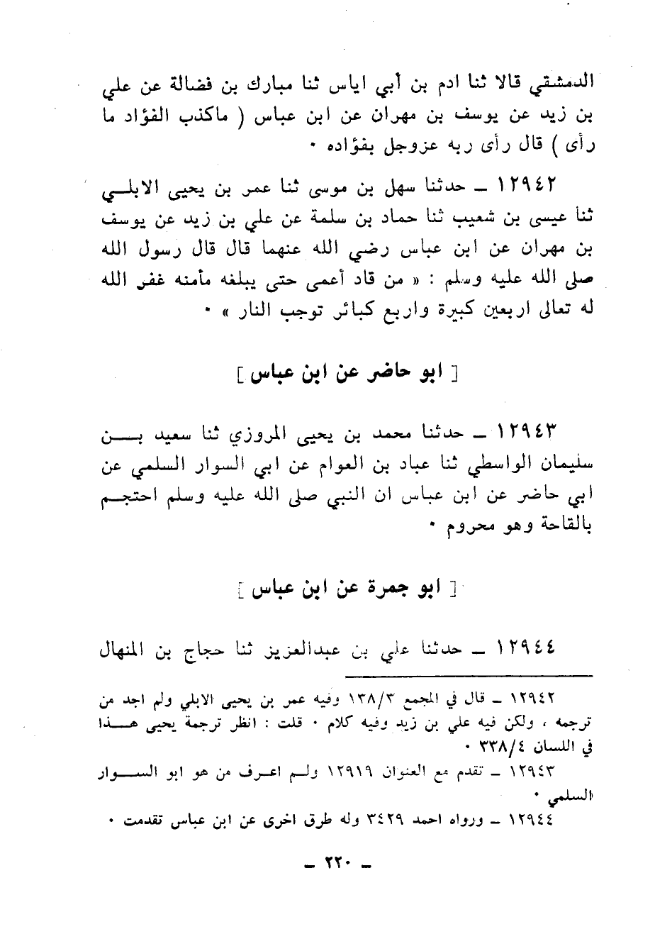 12942 - حَدَّثَنَا سَهْلُ بْنُ مُوسَى، ثنا عُمَرُ بْنُ يَحْيَى الْأُبُلِّيُّ، ثنا عِيسَى بْنُ شُعَيْبٍ، ثنا حَمَّادُ بْنُ سَلَمَةَ، عَنْ عَلِيِّ بْنِ زَيْدٍ، عَنْ يُوسُفَ بْنِ مِهْرَانَ، عَنِ ابْنِ عَبَّاسٍ رَضِيَ اللهُ عَنْهُمَا، قَالَ: قَالَ رَسُولُ اللهِ صَلَّى اللهُ عَلَيْهِ وَسَلَّمَ: «§مَنْ قَادَ أَعْمَى حَتَّى يُبْلِغَهُ مَأْمَنَهُ غَفَرَ اللهُ تَعَالَى لَهُ أَرْبَعِينَ كَبِيرَةً، وَأَرْبَعَ كَبَائِرَ تُوجِبُ النَّارَ»