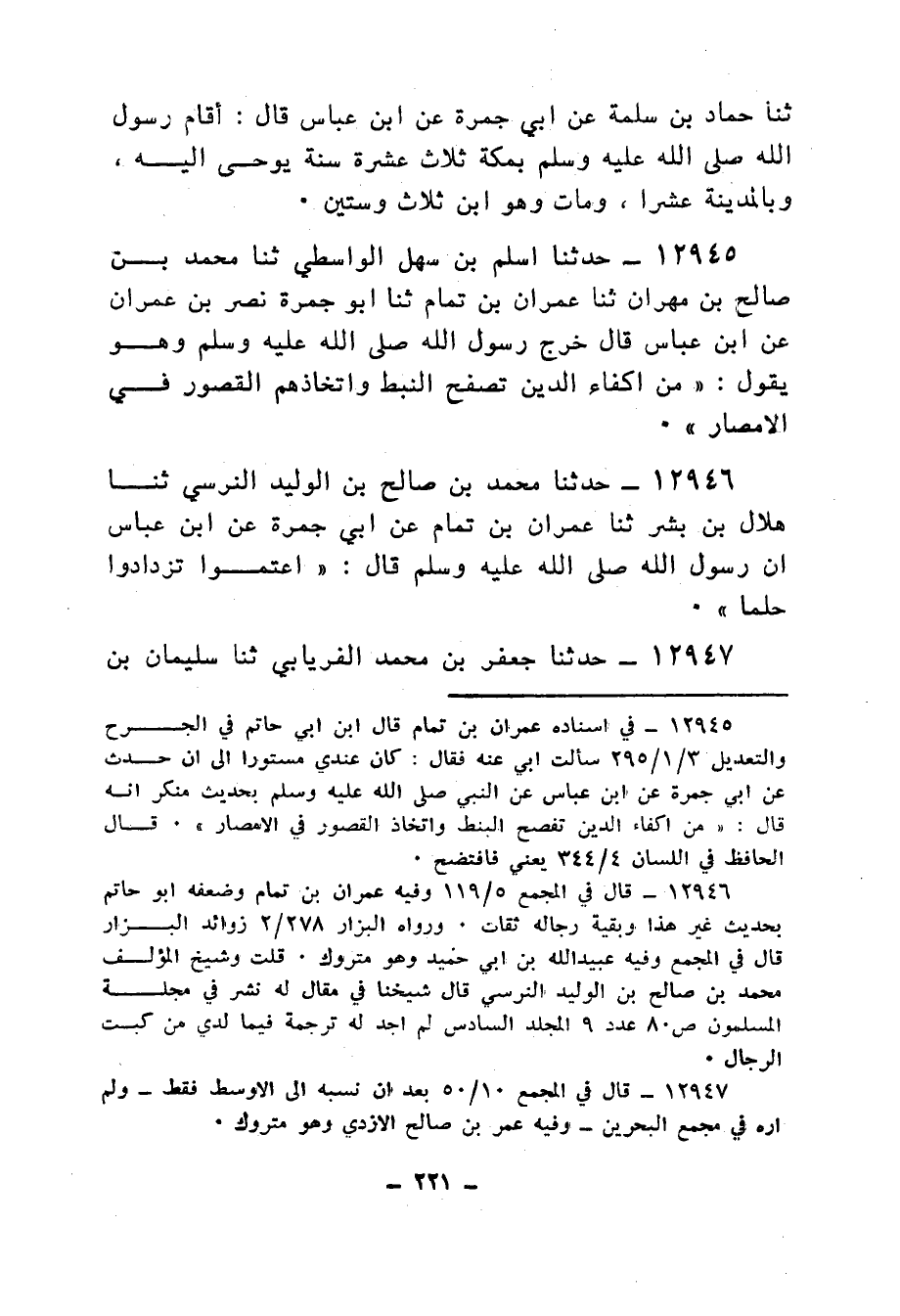 12945 - حَدَّثَنَا أَسْلَمُ بْنُ سَهْلٍ الْوَاسِطِيُّ، ثنا مُحَمَّدُ بْنُ صَالِحِ بْنِ مِهْرَانَ، ثنا عِمْرَانُ بْنُ تَمَامٍ، ثنا أَبُو جَمْرَةَ نَصْرُ بْنُ عِمْرَانَ، عَنِ ابْنِ عَبَّاسٍ، قَالَ: خَرَجَ رَسُولُ اللهِ صَلَّى اللهُ عَلَيْهِ وَسَلَّمَ وَهُوَ يَقُولُ: «§مِنْ إِكْفَاءِ الدِّينِ تَصَفُّحُ النَّبَطِ، وَاتِّخَاذُهُمُ الْقُصُورَ فِي الْأَمْصَارِ»