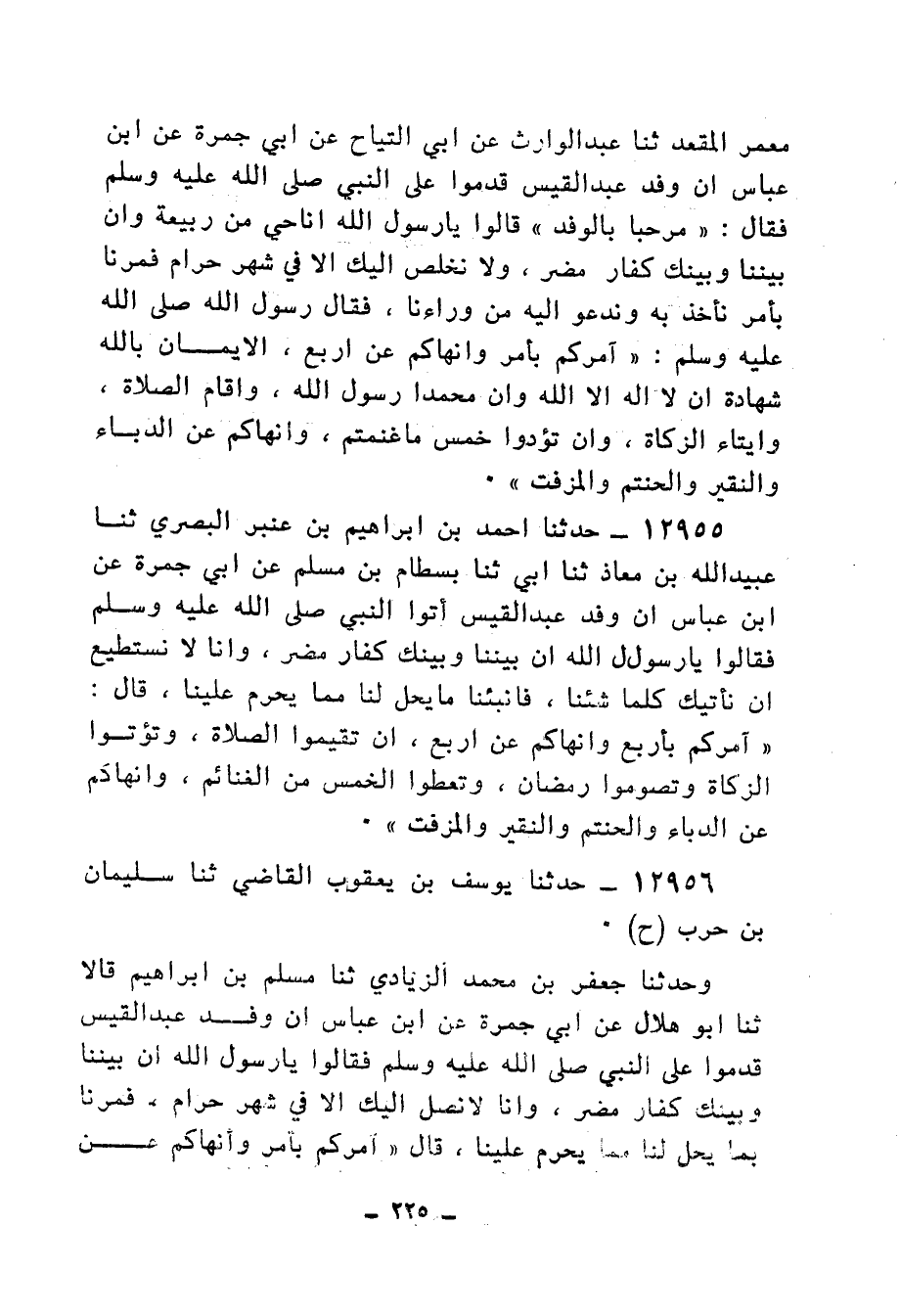 12956 - حَدَّثَنَا يُوسُفُ بْنُ يَعْقُوبَ الْقَاضِي، ثنا سُلَيْمَانُ بْنُ حَرْبٍ، ح وَحَدَّثَنَا جَعْفَرُ بْنُ مُحَمَّدٍ الزِّيَادِيُّ، ثنا مُسْلِمُ بْنُ إِبْرَاهِيمَ، قَالَا: ثنا أَبُو هِلَالٍ، عَنْ أَبِي جَمْرَةَ، عَنِ ابْنِ عَبَّاسٍ أَنَّ وَفْدَ عَبْدِ الْقَيْسِ، قَدِمُوا عَلَى النَّبِيِّ صَلَّى اللهُ عَلَيْهِ وَسَلَّمَ، فَقَالُوا: يَا رَسُولَ اللهِ إِنَّ بَيْنَنَا وَبَيْنَكَ كُفَّارُ مُضَرَ، وَإِنَّا لَا نَصِلُ إِلَيْكَ إِلَّا فِي شَهْرٍ حَرَامٍ , فَمُرْنَا بِمَا يَحِلُّ لَنَا مِمَّا يَحْرُمُ عَلَيْنَا. قَالَ: «§آمُرُكُمْ بِأَمْرٍ، وَأَنْهَاكُمْ عَنْ أَرْبَعٍ، آمُرُكُمْ بِشَهَادَةِ أَنْ لَا إِلَهَ إِلَّا اللهُ، وَإِقَامِ الصَّلَاةِ، وَإِيتَاءِ الزَّكَاةِ، وَصَوْمِ رَمَضَانَ، وَأَنْ تُعْطُوا الْخُمُسَ مِمَّا غَنِمْتُمْ، وَأَنْهَاكُمْ عَنِ الدُّبَّاءِ، وَالْحَنْتَمِ، وَالنَّقِيرِ، وَالْمُزَفَّتِ»