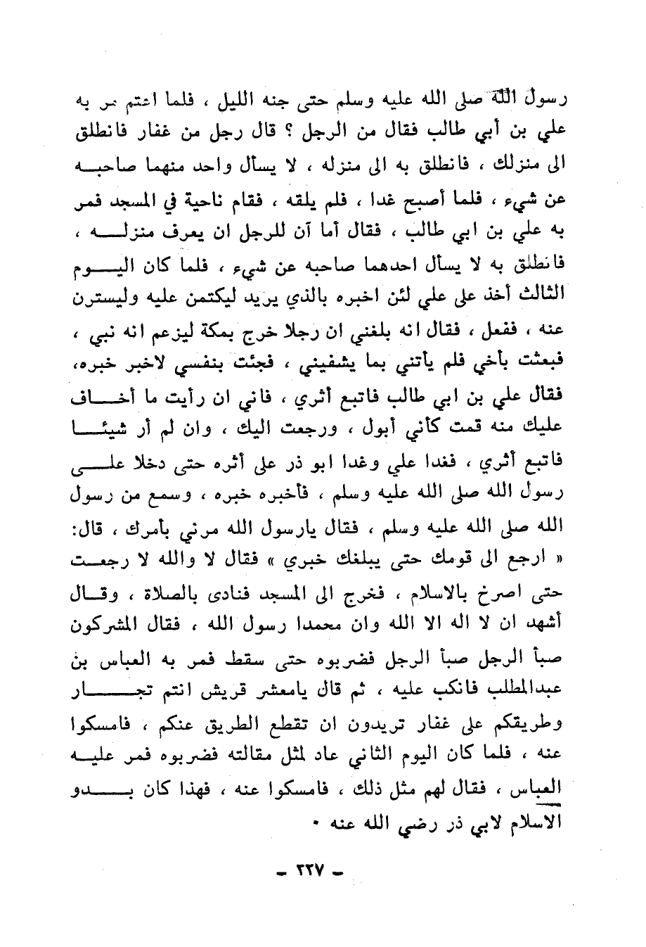 قَالَ : رَجُلٌ مِنْ غِفَارٍ فَانْطَلِقْ إِلَى مَنْزِلِكَ فَانْطَلَقَ بِهِ إِلَى مَنْزِلِهِ لاَ يَسْأَلُ وَاحِدٌ مِنْهُمَا صَاحِبَهُ عَنْ شَيْءٍ ، فَلَمَّا أَصْبَحَ غَدَا فَلَمْ يَلْقَهُ ، فَقَامَ نَاحِيَةً فِي الْمَسْجِدِ فَمَرَّ بِهِ عَلِيُّ بْنُ أَبِي طَالِبٍ ، فَقَالَ : أَمَا آنَ لِلرَّجُلِ أَنْ يَعْرِفَ مَنْزِلَهُ ، فَانْطَلَقَ بِهِ لاَ يَسْأَلُ أَحَدُهُمَا صَاحِبَهُ عَنْ شَيْءٍ ، فَلَمَّا كَانَ الْيَوْمُ الثَّالِثُ أَخَذَ عَلَى عَلِيٍّ لَئِنْ أَخْبَرَهُ بِالَّذِي يُرِيدُ لَيَكْتِمَنَّ عَلَيْهِ وَلَيَسْتُرَنَّ عَنْهُ ، فَفَعَلَ ، فَقَالَ : إِنَّهُ بَلَغَنِي أَنَّ رَجُلاً خَرَجَ بِمَكَّةَ ليَزْعُمُ أَنَّهُ نَبِيٌّ ، فَبَعَثْتُ بِأَخِي فَلَمْ يَأْتِنِي بِمَا يَشْفِينِي ، فَجِئْتُ بِنَفْسِي لأُخْبِرَ خَبَرَهُ ، فَقَالَ عَلِيُّ بْنُ أَبِي طَالِبٍ فَاتَّبِعْ أَثَرِي ، فَإِنِّي إِنْ رَأَيْتُ مَا أَخَافُ عَلَيْكَ مِنْهُ قُمْتُ كَأَنِّي أَبُولُ ، وَرَجَعْتُ إِلَيْكَ ، وَإِنْ لَمْ أَرَ شَيْئًا فَاتَّبِعْ أَثَرِي ، فَغَدَا عَلِيٌّ ، وَغَدَا أَبُو ذَرٍّ عَلَى أَثَرِهِ حَتَّى دَخَلاَ عَلَى رَسُولِ اللهِ صَلَّى اللَّهُ عَلَيْهِ وَسَلَّمَ ، فَأَخْبَرَهُ خَبَرَهُ ، وَسَمِعَ مِنْ رَسُولِ اللهِ صَلَّى اللَّهُ عَلَيْهِ وَسَلَّمَ , فَأَسْلَمَ , فَقَالَ : يَا رَسُولَ اللهِ , مُرْنِي بِأَمْرِكَ ، قَالَ : ارْجِعْ إِلَى قَوْمِكَ حَتَّى يَبْلُغَكَ خَبَرِي ، فَقَالَ : لاَ وَاللَّهِ لاَ رَجَعْتُ حَتَّى أَصْرُخَ بِالإِسْلاَمِ ، فَخَرَجَ إِلَى الْمَسْجِدِ فَنَادَى بِالصَّلاَةِ ، وَقَالَ : أَشْهَدُ أَنْ لاَ إِلَهَ إِلاَّ اللَّهُ ، وَأَنَّ مُحَمَّدًا رَسُولُ اللهِ ، فَقَالَ الْمُشْرِكُونَ : صَبَأَ الرَّجُلُ صَبَأَ الرَّجُلُ ، فضَرَبُوهُ حَتَّى سَقَطَ ، فَمَرَّ بِهِ الْعَبَّاسُ بْنُ عَبْدِ الْمُطَّلِبِ فَانْكَبَّ عَلَيْهِ , ثُمَّ قَالَ : يَا مَعْشَرَ قُرَيْشٍ أَنْتُمْ تُجَّارٌ ، وَطَرِيقُكُمْ عَلَى غِفَارٍ ، تُرِيدُونَ أَنْ نَقْطَعَ الطَّرِيقَ عَنْكُمْ ، فَأَمْسَكُوا عَنْهُ ، فَلَمَّا كَانَ الْيَوْمُ الثَّانِي عَادَ لِمِثْلِ مَقَالَتِهِ فَضَرَبُوهُ فَمَرَّ عَلَيْهِ الْعَبَّاسُ فَقَالَ لَهُمْ مِثْلَ ذَلِكَ ، فَأَمْسَكُوا عَنْهُ ، فَهَذَا كَانُ بُدُوُّ الإِسْلاَمِ لأَبِي ذَرٍّ رَضِيَ اللَّهُ عَنْهُ