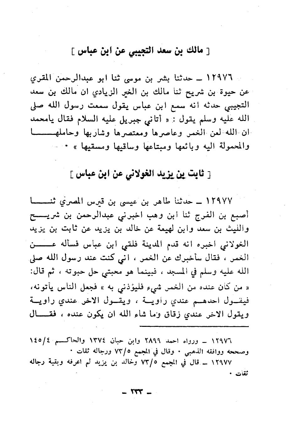 12976 - حَدَّثَنَا بِشْرُ بْنُ مُوسَى، ثنا أَبُو عَبْدِ الرَّحْمَنِ الْمُقْرِئُ، عَنْ حَيْوَةَ بْنِ شُرَيْحٍ، ثنا مَالِكُ بْنُ الْخَيْرِ الزِّيَادِيُّ أَنَّ مَالِكَ بْنَ سَعْدٍ التُّجِيبِيَّ حَدَّثَهُ أَنَّهُ: سَمِعَ ابْنَ عَبَّاسٍ، يَقُولُ: سَمِعْتُ رَسُولَ اللهِ صَلَّى اللهُ عَلَيْهِ وَسَلَّمَ يَقُولُ: " أَتَانِي جِبْرِيلُ عَلَيْهِ السَّلَامُ، فَقَالَ: يَا مُحَمَّدُ إِنَّ §اللهَ لَعَنَ الْخَمْرَ وَعَاصِرَهَا وَمُعْتَصِرَهَا وَشَارِبَهَا وَحَامِلَهَا وَالْمَحْمُولَةَ إِلَيْهِ وَبَائِعَهَا وَمُبْتَاعَهَا وَسَاقِيَهَا وَمُسْقِيَهَا "
