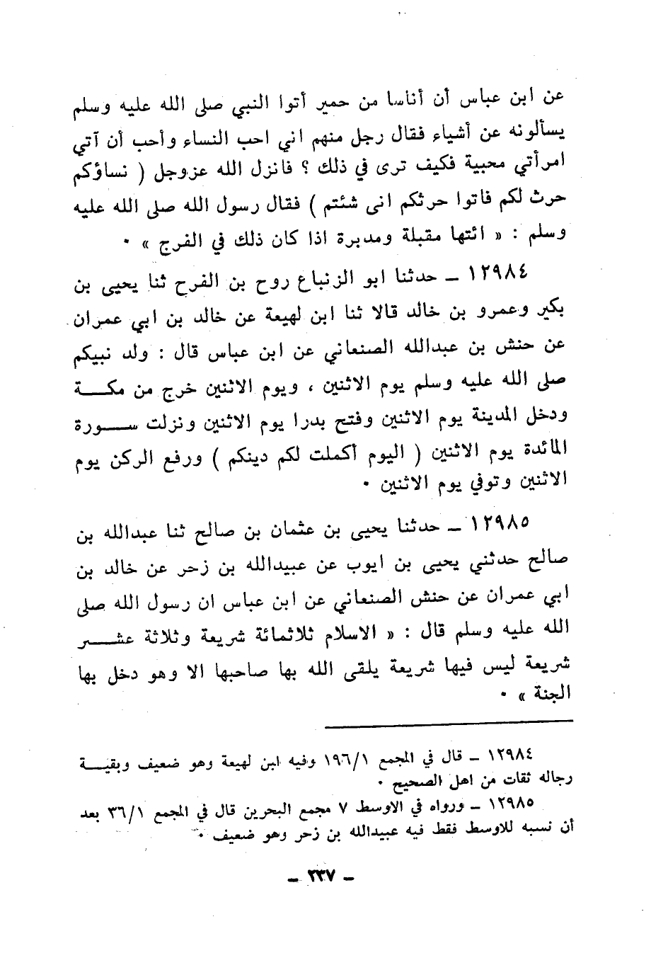 12985 - حَدَّثَنَا يَحْيَى بْنُ عُثْمَانَ بْنِ صَالِحٍ، ثنا عَبْدُ اللهِ بْنُ صَالِحٍ، حَدَّثَنِي يَحْيَى بْنُ أَيُّوبَ، عَنْ عُبَيْدِ اللهِ بْنِ زَحْرٍ، عَنْ خَالِدِ بْنِ أَبِي عِمْرَانَ، عَنْ حَنَشٍ الصَّنْعَانِيِّ، عَنِ ابْنِ عَبَّاسٍ أَنَّ رَسُولَ اللهِ صَلَّى اللهُ عَلَيْهِ وَسَلَّمَ قَالَ: «§الْإِسْلَامُ ثَلَاثُمِائَةِ شَرِيعَةٍ، وَثَلَاثَةَ عَشَرَ شَرِيعَةً لَيْسَ فِيهَا شَرِيعَةٌ يَلْقَى اللهَ بِهَا صَاحِبُهَا إِلَّا، وَهُوَ يَدْخُلُ بِهَا الْجَنَّةَ»