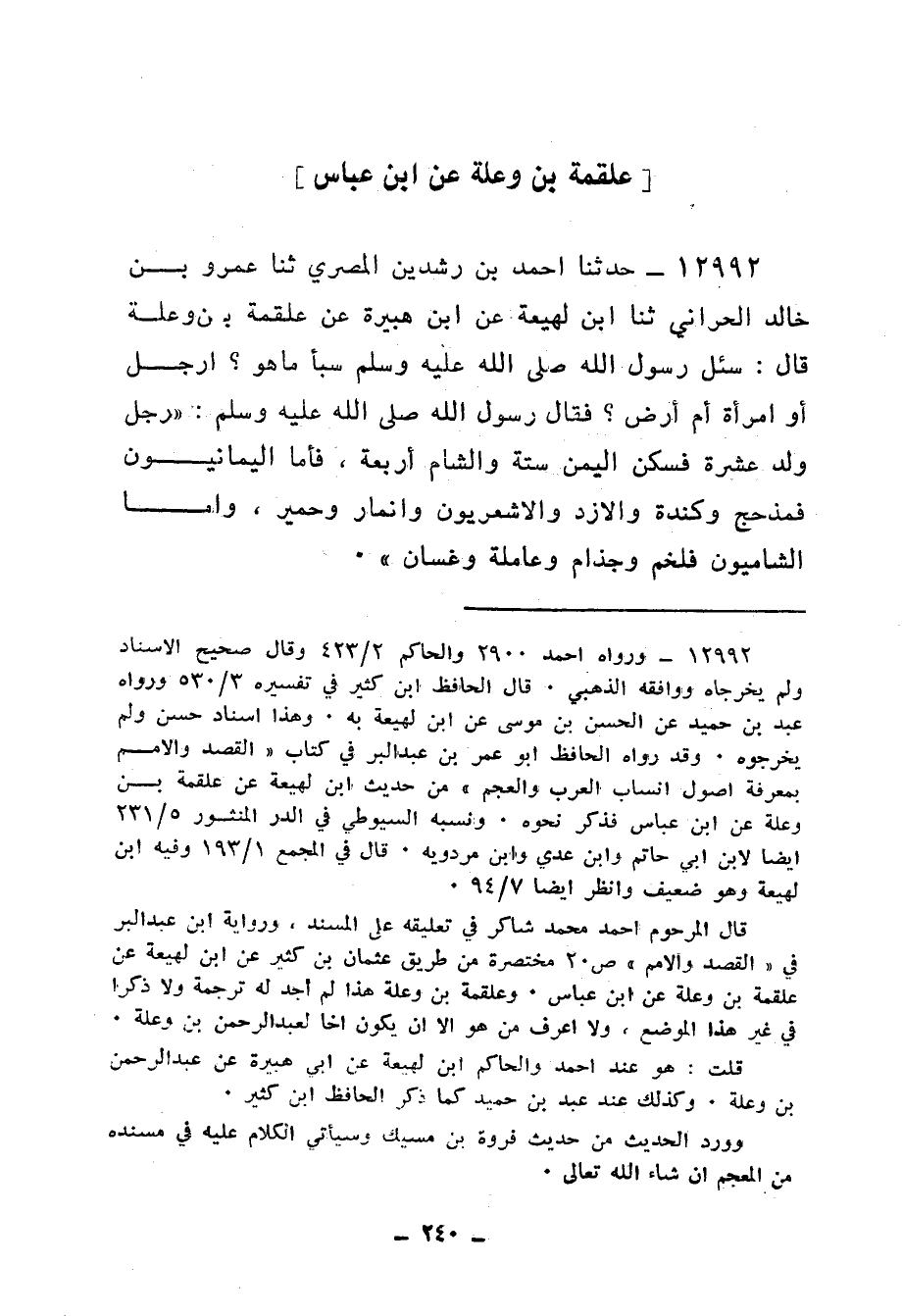 12992 - حَدَّثَنَا أَحْمَدُ بْنُ رِشْدِينَ الْمِصْرِيُّ، ثنا عَمْرُو بْنُ خَالِدٍ الْحَرَّانِيُّ، ثنا ابْنُ لَهِيعَةَ، عَنِ ابْنِ هُبَيْرَةَ، عَنْ عَلْقَمَةَ بْنِ وَعْلَةَ قَالَ: سُئِلَ رَسُولُ اللهِ صَلَّى اللهُ عَلَيْهِ وَسَلَّمَ سَبَأٌ مَا هُوَ؟ أَرَجُلٌ أَوِ امْرَأَةٌ أَمْ أَرْضٌ , فَقَالَ رَسُولُ اللهِ صَلَّى اللهُ عَلَيْهِ وَسَلَّمَ: «§رَجُلٌ وَلَدَ عَشَرَةً فَسَكَنَ الْيَمَنَ سِتَّةً، وَالشَّامَ أَرْبَعَةً، فَأَمَّا الْيَمَانِيُّونَ فَمَذْحِجٌ، وَكِنْدَةُ، وَالْأَزْدُ، وَالْأَشْعَرِيُّونَ، وَأَنْمَارٌ، وَحِمْيَرُ، وَأَمَّا الشَّامِيُّونَ، فَلَخْمٌ، وَجُذَامُ، وَعَامِلَةُ، وَغَسَّانُ»