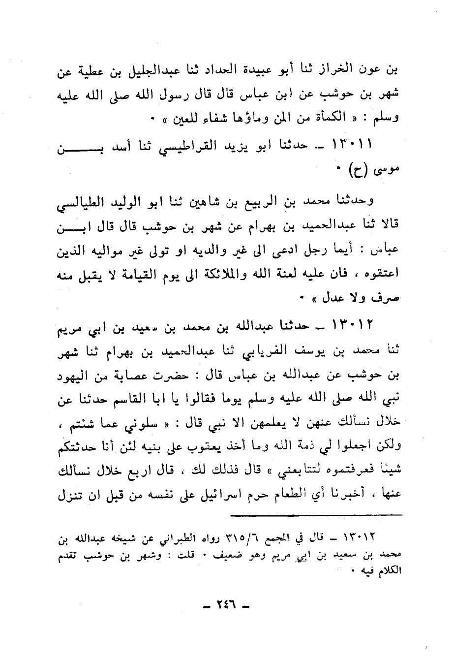 13011 - حَدَّثَنَا أَبُو يَزِيدَ الْقَرَاطِيسِيُّ، ثنا أَسَدُ بْنُ مُوسَى، ح وَحَدَّثَنَا مُحَمَّدُ بْنُ الرَّبِيعِ بْنِ شَاهِينَ، ثنا أَبُو الْوَلِيدِ الطَّيَالِسِيُّ، قَالَا: ثنا عَبْدُ الْحَمِيدِ بْنُ بَهْرَامَ، عَنْ شَهْرِ بْنِ حَوْشَبٍ، قَالَ: قَالَ ابْنُ عَبَّاسٍ: «§أَيُّمَا رَجُلٍ ادَّعَى إِلَى غَيْرِ وَالِدَيْهِ أَوْ تَوَلَّى غَيْرَ مَوَالِيهِ الَّذِينَ أَعْتَقُوهُ فَإِنَّ عَلَيْهِ لَعْنَةَ اللهِ وَالْمَلَائِكَةِ إِلَى يَوْمِ الْقِيَامَةِ لَا يُقْبَلُ مِنْهُ صَرْفٌ وَلَا عَدْلٌ»