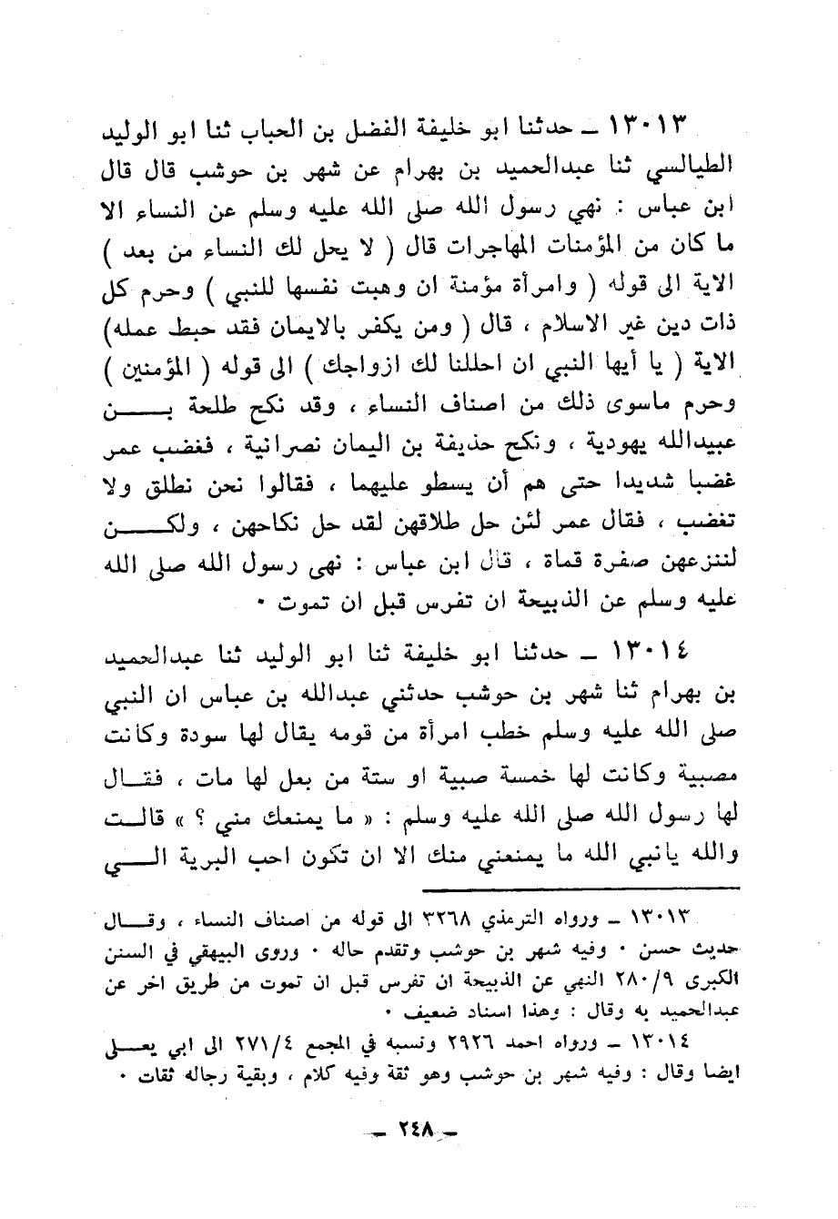 13013 - حَدَّثَنَا أَبُو خَلِيفَةَ الْفَضْلُ بْنُ الْحُبَابٍ، ثنا أَبُو الْوَلِيدِ الطَّيَالِسِيُّ، ثنا عَبْدُ الْحَمِيدِ بْنُ بَهْرَامَ، عَنْ شَهْرِ بْنِ حَوْشَبٍ، قَالَ: قَالَ ابْنُ عَبَّاسٍ: «§نُهِيَ رَسُولُ اللهِ صَلَّى اللهُ عَلَيْهِ وَسَلَّمَ عَنِ النِّسَاءِ إِلَّا مَا كَانَ مِنَ الْمُؤْمِنَاتِ الْمُهَاجِرَاتِ» قَالَ: {لَا يَحِلُّ لَكَ النِّسَاءُ مِنْ بَعْدُ} [الأحزاب: 52] الْآيَةُ إِلَى قَوْلِهِ: {وَامْرَأَةٌ مُؤْمِنَةٌ إِنْ وَهَبَتْ نَفْسَهَا لِلنَّبِيِّ} [الأحزاب: 50] وَحَرَّمَ كُلَّ ذَاتِ دِينٍ غَيْرِ الْإِسْلَامِ، قَالَ {وَمَنْ يَكْفُرْ بِالْإِيمَانِ فَقَدْ حَبِطَ عَمَلُهُ} [المائدة: 5] الْآيَةَ: {يَا أَيُّهَا النَّبِيُّ إِنَّا أَحْلَلْنَا لَكَ أَزْوَاجَكَ} [الأحزاب: 50] إِلَى قَوْلِهِ: {الْمُؤْمِنِينَ} [الأحزاب: 50] وَحَرَّمَ مَا سِوَى ذَلِكَ مِنْ أَصْنَافِ النِّسَاءِ، وَقَدْ نَكَحَ طَلْحَةُ بْنُ عُبَيْدِ اللهِ يَهُودِيَّةً، وَنَكَحَ حُذَيْفَةُ بْنُ الْيَمَانِ نَصْرَانِيَّةً، فَغَضِبَ عُمَرُ غَضَبًا شَدِيدًا حَتَّى هَمَّ أَنْ يَسْطُوَ عَلَيْهِمَا، فَقَالُوا: نَحْنُ نُطَلِّقُ، وَلَا تَغْضَبُ، فَقَالَ عُمَرُ: لَئِنْ حَلَّ طَلَاقُهُنَّ لَقَدْ حَلَّ نِكَاحُهُنَّ، وَلَكِنْ لَنَنْزِعُهُنَّ صُفْرَةً قُمَاةً