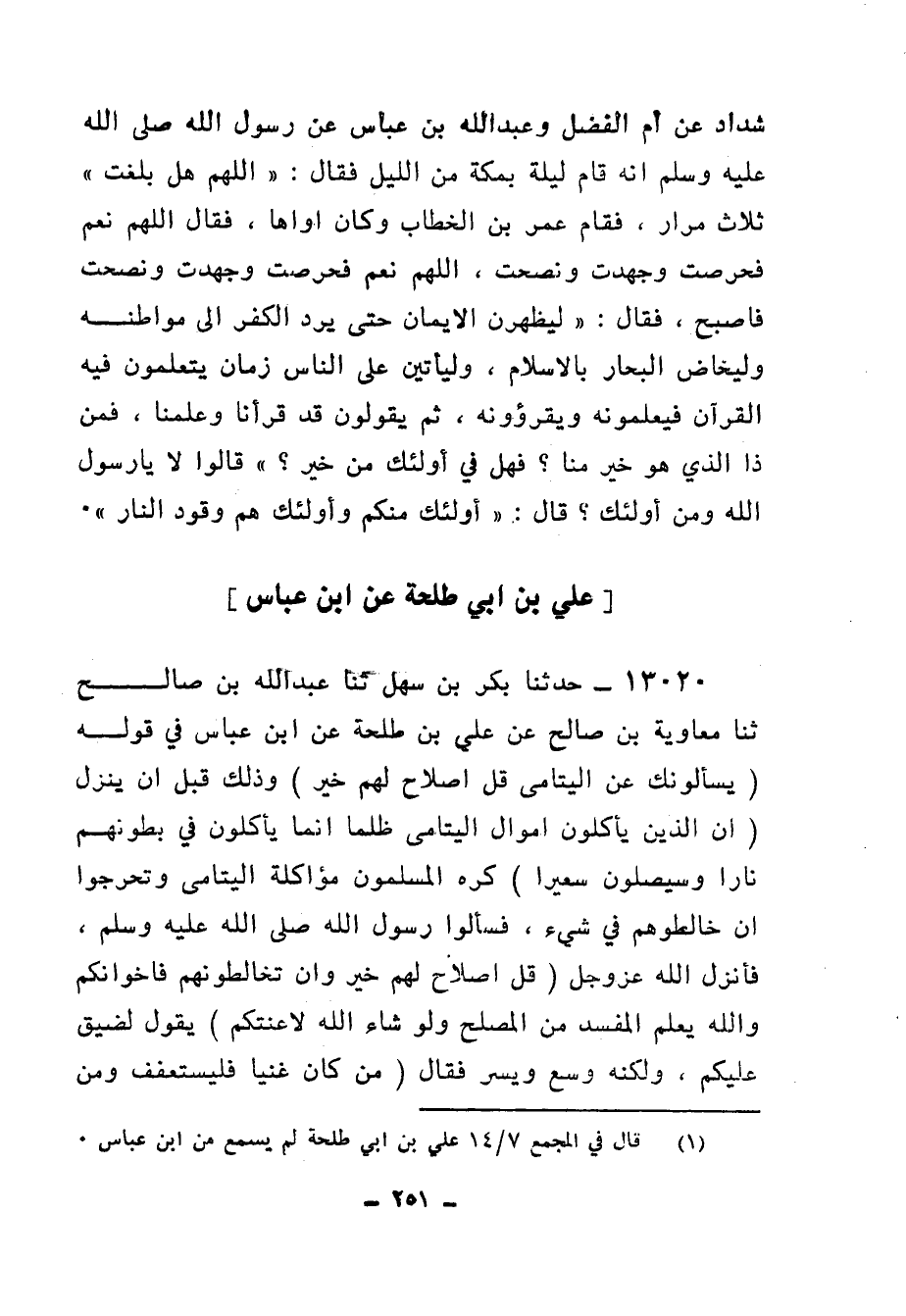 13020 - حَدَّثَنَا بَكْرُ بْنُ سَهْلٍ، ثنا عَبْدُ اللهِ بْنُ صَالِحٍ، ثنا مُعَاوِيَةُ بْنُ صَالِحٍ، عَنْ عَلِيِّ بْنِ طَلْحَةَ، عَنِ ابْنِ عَبَّاسٍ فِي قَوْلِهِ: {يَسْأَلُونَكَ عَنِ الْيَتَامَى قُلْ إِصْلَاحٌ لَهُمْ خَيْرٌ} [البقرة: 220] وَذَلِكَ قَبْلَ أَنْ يَنْزِلَ: {إِنَّ الَّذِينَ يَأْكُلُونَ أَمْوَالَ الْيَتَامَى ظُلْمًا إِنَّمَا يَأْكُلُونَ فِي بُطُونِهِمْ نَارًا وَسَيَصْلَوْنَ سَعِيرًا} [النساء: 10] كَرِهَ الْمُسْلِمُونَ مُؤَاكَلَةَ الْيَتَامَى وَتَحَرَّجُوا إِنْ خَالَطُوهُمْ فِي شَيْءٍ، فَسَأَلُوا رَسُولَ اللهِ صَلَّى اللهُ عَلَيْهِ وَسَلَّمَ، فَأَنْزَلَ اللهُ عَزَّ وَجَلَّ: " {§قُلْ إِصْلَاحٌ لَهُمْ خَيْرٌ وَإِنْ تُخَالِطُوهُمْ فَإِخْوَانُكُمْ وَاللهُ يَعْلَمُ الْمُفْسِدَ مِنَ الْمُصْلِحِ وَلَوْ شَاءَ اللهُ لَأَعْنَتَكُمْ} [البقرة: 220] يَقُولُ: لَضَيَّقَ عَلَيْكُمْ، وَلَكِنَّهُ وَسَّعَ وَيَسَّرَ، فَقَالَ: {مَنْ كَانَ غَنِيًّا فَلْيَسْتَعْفِفْ وَمَنْ كَانَ فَقِيرًا فَلْيَأْكُلْ بِالْمَعْرُوفِ} [النساء: 6] ، يَقُولُ: يَأْكُلُ الْفَقِيرُ إِذَا وَلِيَ مَالَ الْيَتِيمِ بِقَدْرِ قِيَامِهِ عَلَى مَالِهِ وَمَنْفَعَتِهِ مَا لَمْ يُسْرِفْ
