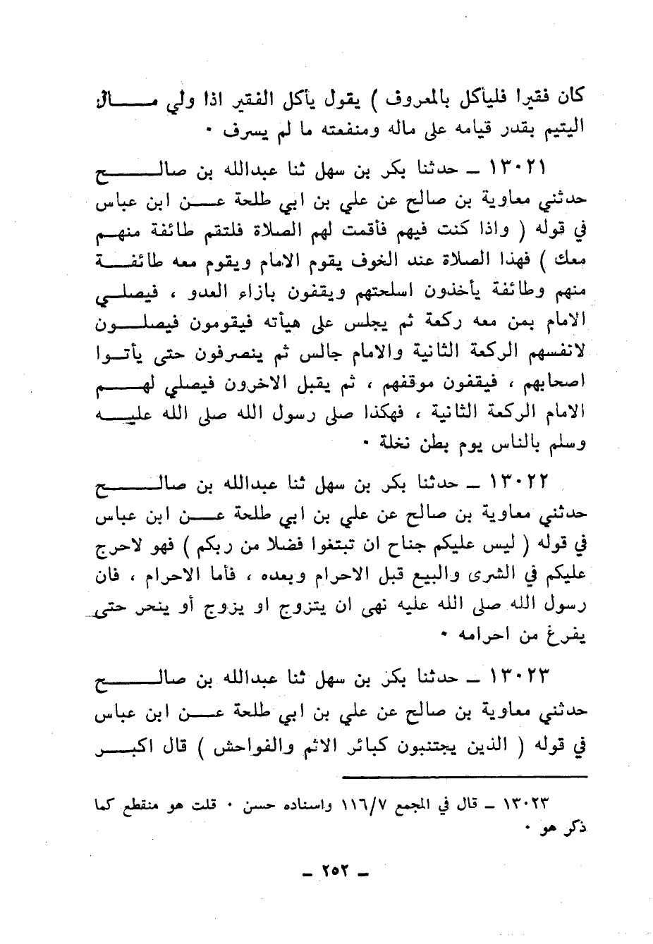 13021 - حَدَّثَنَا بَكْرُ بْنُ سَهْلٍ، ثنا عَبْدُ اللهِ بْنُ صَالِحٍ، حَدَّثَنِي مُعَاوِيَةُ بْنُ صَالِحٍ، عَنْ عَلِيِّ بْنِ أَبِي طَلْحَةَ، عَنِ ابْنِ عَبَّاسٍ فِي قَوْلِهِ: {وَإِذَا كُنْتَ فِيهِمْ فَأَقَمْتَ لَهُمُ الصَّلَاةَ فَلْتَقُمْ طَائِفَةٌ مِنْهُمْ مَعَكَ} [النساء: 102] فَهَذَا الصَّلَاةُ عِنْدَ الْخَوْفِ يَقُومُ الْإِمَامُ، وَيَقُومُ مَعَهُ طَائِفَةٌ مِنْهُمْ، وَطَائِفَةٌ يَأْخُذُونَ أَسْلِحَتَهُمْ، وَيَقِفُونَ بِإِزَاءِ الْعَدُوِّ، فَيُصَلِّي الْإِمَامُ بِمَنْ مَعَهُ رَكْعَةً , ثُمَّ يَجْلِسُ عَلَى هَيْئَتِهِ فَيَقُومُونَ، فَيُصَلُّونَ لِأَنْفُسِهِمُ الرَّكْعَةَ الثَّانِيَةَ وَالْإِمَامُ جَالِسٌ، ثُمَّ يَنْصَرِفُونَ حَتَّى يَأْتُوا أَصْحَابَهُمْ فَيَقِفُونَ مَوْقِفَهُمْ , ثُمَّ يُقْبِلُ الْآخَرُونَ فَيُصَلِّي لَهُمُ الْإِمَامُ الرَّكْعَةَ الثَّانِيَةَ، فَهَكَذَا «§صَلَّى رَسُولُ اللهِ صَلَّى اللهُ عَلَيْهِ وَسَلَّمَ بِالنَّاسِ يَوْمَ بَطْنِ نَخْلَةَ»