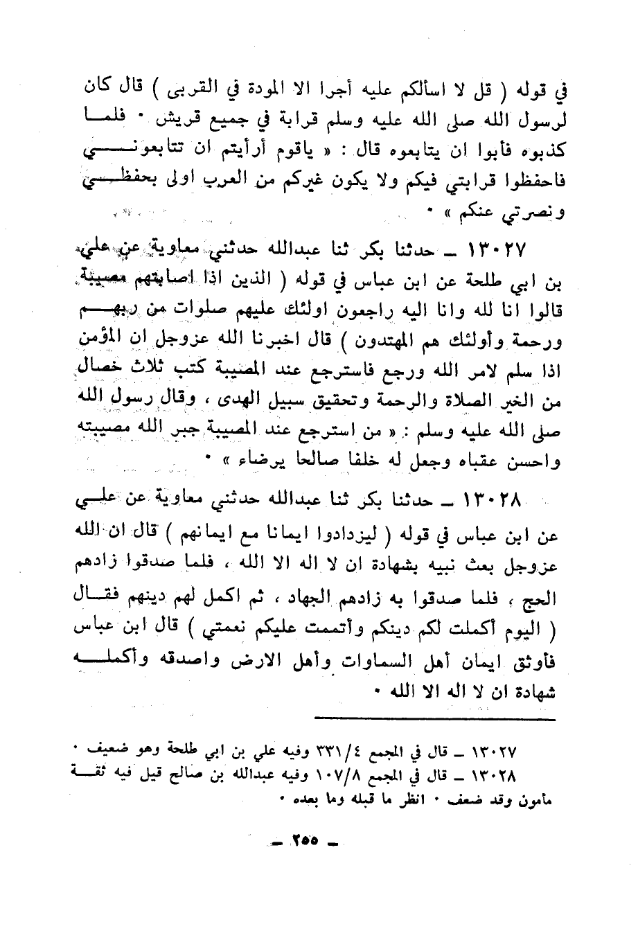 13027 - حَدَّثَنَا بَكْرٌ، ثنا عَبْدُ اللهِ، حَدَّثَنِي مُعَاوِيَةُ، عَنْ عَلِيِّ بْنِ أَبِي طَلْحَةَ، عَنِ ابْنِ عَبَّاسٍ، فِي قَوْلِهِ: {الَّذِينَ إِذَا أَصَابَتْهُمْ مُصِيبَةٌ قَالُوا إِنَّا لِلَّهِ، وَإِنَّا إِلَيْهِ رَاجِعُونَ أُولَئِكَ عَلَيْهِمْ صَلَوَاتٌ مِنْ رَبِّهِمْ وَرَحْمَةٌ وَأُولَئِكَ هُمُ الْمُهْتَدُونَ} [البقرة: 157] ، قَالَ: أَخْبَرَنَا اللهُ عَزَّ وَجَلَّ: أَنَّ الْمُؤْمِنَ إِذَا سَلَّمَ لِأَمْرِ اللهِ وَرَجَعَ , فَاسْتَرْجَعَ عِنْدَ الْمُصِيبَةِ كَتَبَ ثَلَاثَ خِصَالٍ مِنَ الْخَيْرِ: الصَّلَاةُ، وَالرَّحْمَةُ وَتَحْقِيقُ سَبِيلِ الْهُدَى، وَقَالَ رَسُولُ اللهِ صَلَّى اللهُ عَلَيْهِ وَسَلَّمَ: «§مَنِ اسْتَرْجَعَ عِنْدَ الْمُصِيبَةِ جَبَرَ اللهُ مُصِيبَتَهُ، وَأَحْسَنَ عُقْبَاهُ، وَجَعَلَ لَهُ خَلَفًا صَالِحًا يَرْضَاهُ»
