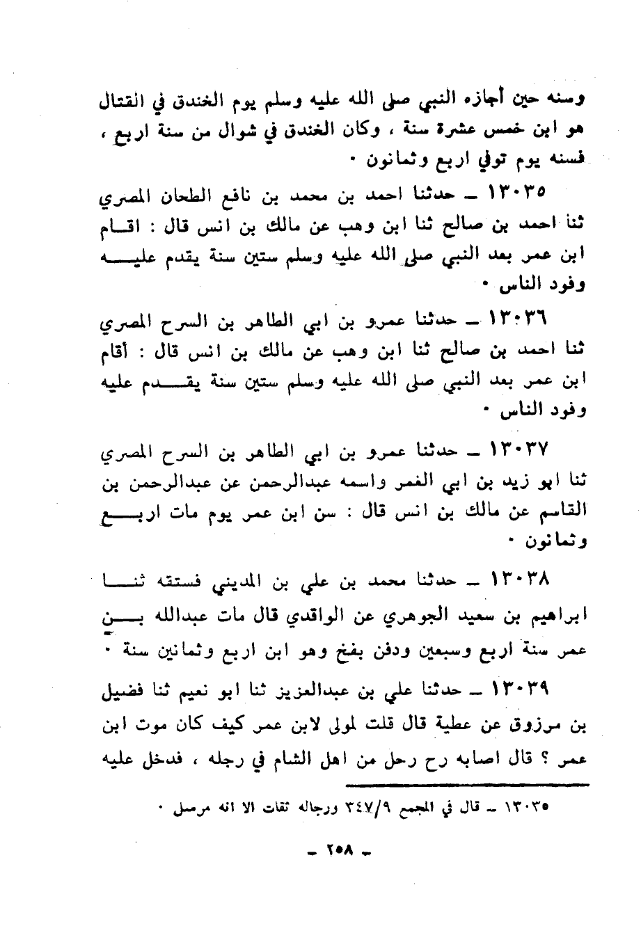 13036 - حَدَّثَنَا عَمْرُو بْنُ أَبِي الطَّاهِرِ بْنِ السَّرْحِ الْمِصْرِيُّ، ثنا أَحْمَدُ بْنُ صَالِحٍ، ثنا ابْنُ وَهْبٍ، عَنْ مَالِكِ بْنِ أَنَسٍ، قَالَ: «§أَقَامَ ابْنُ عُمَرَ بَعْدَ النَّبِيِّ صَلَّى اللهُ عَلَيْهِ وَسَلَّمَ سِتِّينَ سَنَةً يَقْدَمُ عَلَيْهِ وُفُودُ النَّاسِ»