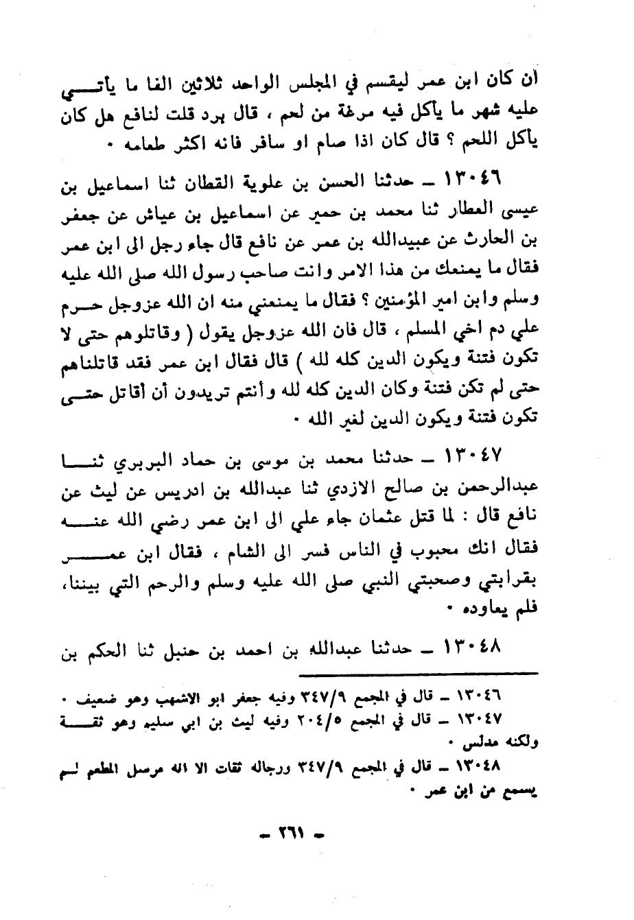 13046 - حَدَّثَنَا الْحَسَنُ بْنُ عَلُّويَةَ الْقَطَّانُ، ثنا إِسْمَاعِيلُ بْنُ عِيسَى الْعَطَّارُ، ثنا مُحَمَّدُ بْنُ حِمْيَرَ، عَنْ إِسْمَاعِيلَ بْنِ عَيَّاشٍ، عَنْ جَعْفَرِ بْنِ الْحَارِثِ، عَنْ عُبَيْدِ اللهِ بْنِ عُمَرَ، عَنْ نَافِعٍ، قَالَ: جَاءَ رَجُلٌ إِلَى ابْنِ عُمَرَ فَقَالَ: مَا يَمْنَعُكُ مِنْ هَذَا الْأَمْرِ وَأَنْتَ صَاحِبُ رَسُولِ اللهِ صَلَّى اللهُ عَلَيْهِ وَسَلَّمَ، وَابْنُ أَمِيرِ الْمُؤْمِنِينَ؟ فَقَالَ: «مَا يَمْنَعُنِي مِنْهِ أَنَّ اللهَ عَزَّ وَجَلَّ حَرَّمَ عَلَيَّ دَمَ أَخِي الْمُسْلِمِ» ، قَالَ: فَإِنَّ اللهَ عَزَّ وَجَلَّ يَقُولُ: {وَقَاتِلُوهُمْ حَتَّى لَا تَكُونَ فِتْنَةٌ وَيَكُونَ الدِّينُ كُلُّهُ لِلَّهِ} [الأنفال: 39] قَالَ: فَقَالَ ابْنُ عُمَرَ: «§فَقَدْ قَاتَلْنَاهُمْ حَتَّى لَمْ تَكُنْ فِتْنَةٌ وَكَانَ الدِّينُ كُلُّهُ لِلَّهِ، وَأَنْتُمْ تُرِيدُونَ أَنْ أُقَاتِلَ حَتَّى تَكُونَ فِتْنَةٌ، وَيَكُونَ الدِّينُ لِغَيْرِ اللهِ»