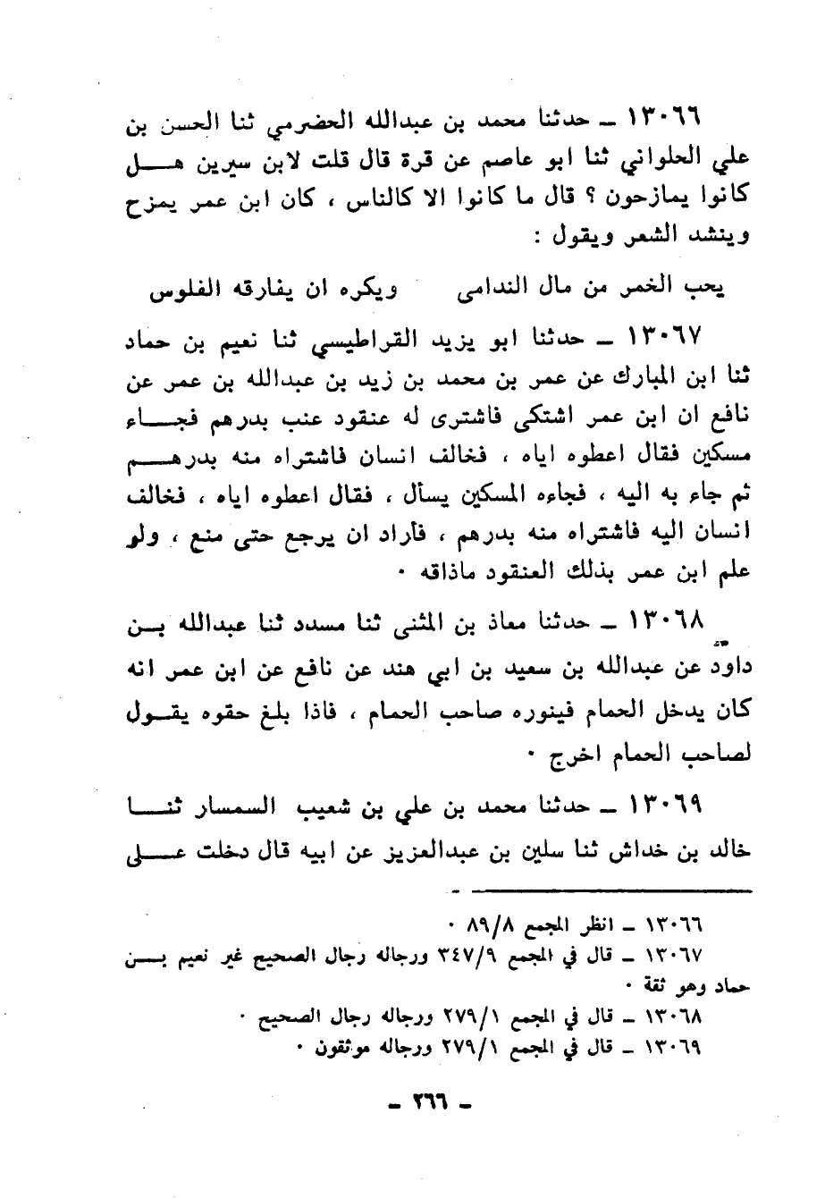 13067 - حَدَّثَنَا أَبُو يَزِيدَ الْقَرَاطِيسِيُّ، ثنا نُعَيْمُ بْنُ حَمَّادٍ، ثنا ابْنُ الْمُبَارَكِ، عَنْ عُمَرَ بْنِ مُحَمَّدِ بْنِ زَيْدِ بْنِ عَبْدِ اللهِ بْنِ عُمَرَ، عَنْ نَافِعٍ أَنَّ ابْنَ عُمَرَ، اشْتَكَى فَاشْتُرِيَ لَهُ عُنْقُودُ عِنَبٍ بِدِرْهَمٍ، فَجَاءَ مِسْكِينٌ , فَقَالَ: «§أَعْطُوهُ إِيَّاهُ» فَخَالَفَ إِنْسَانٌ فَاشْتَرَاهُ مِنْهُ بِدِرْهَمٍ , ثُمَّ جَاءَ بِهِ إِلَيْهِ، فَجَاءَه الْمِسْكِينُ يَسْأَلُ، فَقَالَ: اعْطُوهُ إِيَّاهُ، فَخَالَفَ إِنْسَانٌ إِلَيْهِ، فَاشْتَرَاهُ مِنْهُ بِدِرْهَمٍ، فَأَرَادَ أَنْ يَرْجِعَ حَتَّى مُنِعَ «وَلَوْ عَلِمَ ابْنُ عُمَرَ بِذَلِكَ الْعُنْقُودِ مَا ذَاقَهُ»