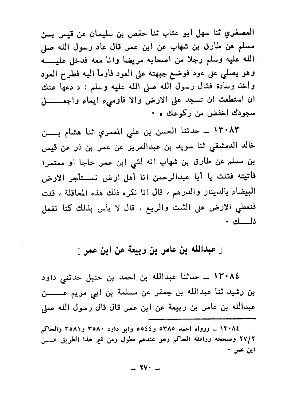 13083 - حَدَّثَنَا الْحَسَنُ بْنُ عَلِيٍّ الْمَعْمَرِيُّ، ثنا هِشَامُ بْنُ خَالِدٍ الدِّمَشْقِيُّ، ثنا سُوَيْدُ بْنُ عَبْدِ الْعَزِيزِ، عَنْ عُمَرَ بْنِ ذَرٍّ، عَنْ قَيْسِ بْنِ مُسْلِمٍ، عَنْ طَارِقِ بْنِ شِهَابٍ أَنَّهُ: لَقِيَ ابْنَ عُمَرَ حَاجًّا، أَوْ مُعْتَمِرًا فَأَتَيْتُهُ فَقُلْتُ: يَا أَبَا عَبْدِ الرَّحْمَنِ إِنَّا أَهْلُ أَرْضٍ نَسْتَأْجِرُ الْأَرْضَ الْبَيْضَاءَ بِالدِّينَارِ وَالدِّرْهَمِ. قَالَ: «§إِنَّا نَكْرَهُ ذَلِكَ هَذِهِ الْمُحَاقَلَةَ» ، قُلْتُ: فَنُعْطِي الْأَرْضَ عَلَى الثُّلُثِ وَالرُّبُعِ، قَالَ: «لَا بَأْسَ بِذَلِكَ كُنَّا نَفْعَلُ ذَلِكَ»