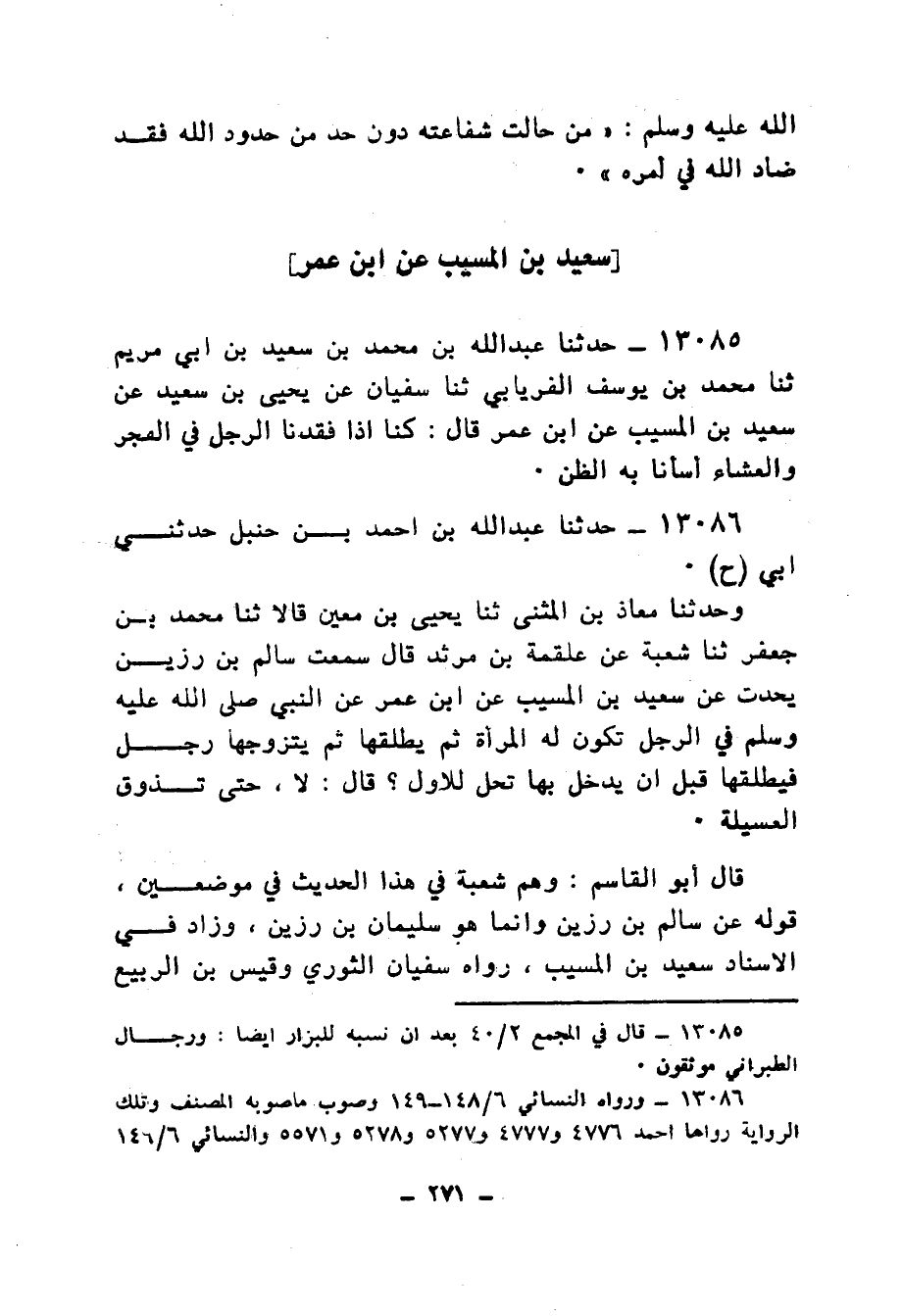 13086 - حَدَّثَنَا عَبْدُ اللهِ بْنُ أَحْمَدَ بْنِ حَنْبَلٍ، حَدَّثَنِي أَبِي، ح وَحَدَّثَنَا مُعَاذُ بْنُ الْمُثَنَّى، ثنا يَحْيَى بْنُ مَعِينٍ، قَالَا: ثنا مُحَمَّدُ بْنُ جَعْفَرٍ، ثنا شُعْبَةُ، عَنْ عَلْقَمَةَ بْنِ مَرْثَدٍ، قَالَ: سَمِعْتُ سَالِمَ بْنَ رَزِينٍ يُحَدِّثُ عَنْ سَعِيدِ بْنِ الْمُسَيِّبِ، عَنِ ابْنِ عُمَرَ، عَنِ النَّبِيِّ صَلَّى اللهُ عَلَيْهِ وَسَلَّمَ، §فِي الرَّجُلِ تَكُونُ لَهُ الْمَرْأَةُ، ثُمَّ يُطَلِّقُهَا، ثُمَّ يَتَزَوَّجُهَا رَجُلٌ، فَيُطَلِّقُهَا قَبْلَ أَنْ يَدْخُلَ بِهَا تَحِلُّ لِلْأَوَّلِ؟ قَالَ: «لَا , حَتَّى تَذُوقَ الْعُسَيْلَةَ» قَالَ أَبُو الْقَاسِمِ: " وَهِمَ شُعْبَةُ فِي هَذَا الْحَدِيثِ فِي مَوْضِعَيْنِ، قَوْلِهِ: عَنْ سَالِمِ بْنِ رَزِينٍ، وَإِنَّمَا هُوَ سُلَيْمَانُ بْنُ رَزِينٍ، وَزَادَ فِي الْإِسْنَادِ سَعِيدَ بْنَ الْمُسَيِّبِ، رَوَاهُ سُفْيَانُ الثَّوْرِيُّ، وَقَيْسُ بْنُ الرَّبِيعِ، عَنْ عَلْقَمَةَ بْنِ مَرْثَدٍ، عَنْ سُلَيْمَانَ بْنِ رَزِينٍ الْأَحْمَرِ، عَنِ ابْنِ عُمَرَ، عَنِ النَّبِيِّ صَلَّى اللهُ عَلَيْهِ وَسَلَّمَ، وَهُوَ الصَّوَابُ "