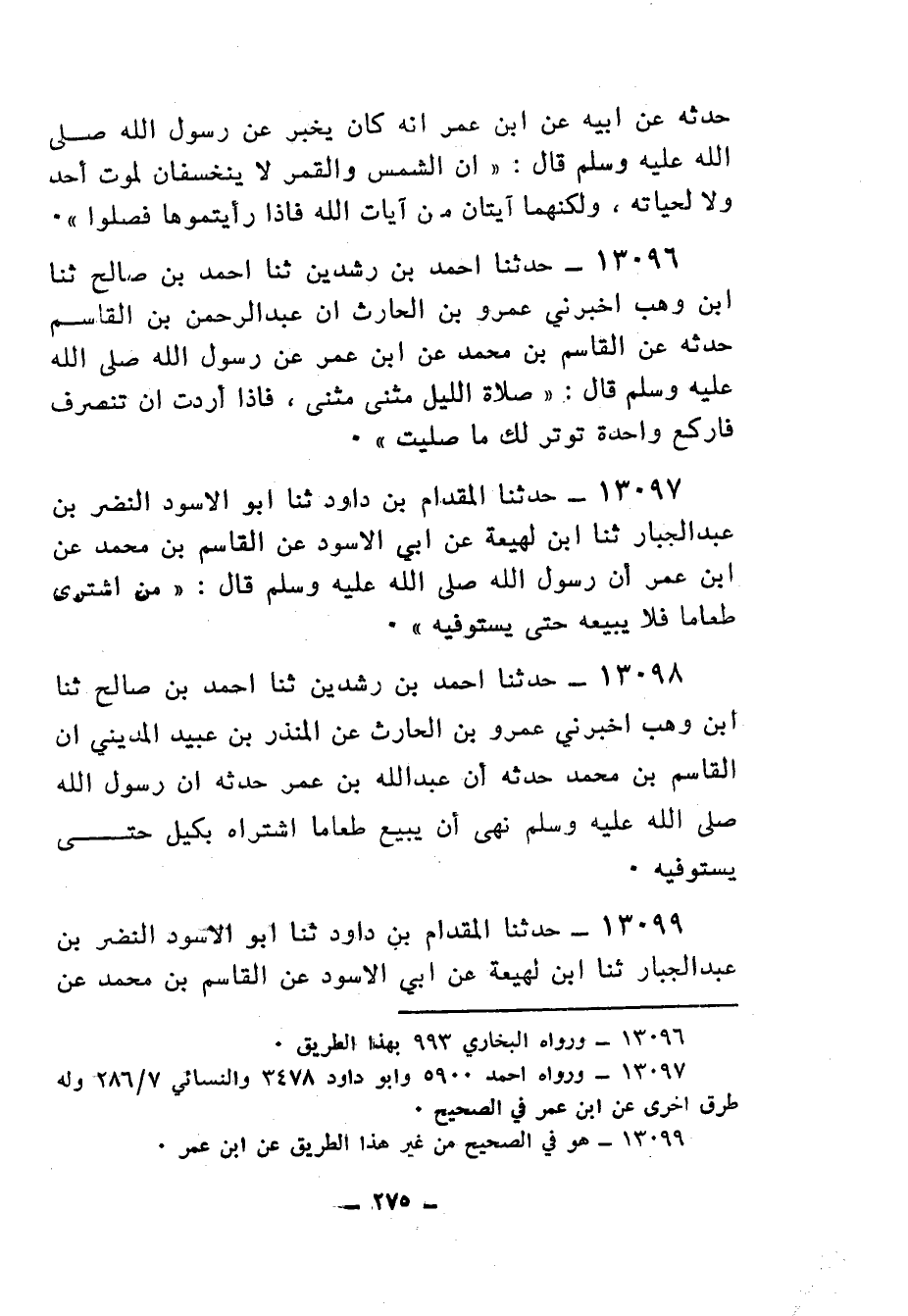13097 - حَدَّثَنَا الْمِقْدَامُ بْنُ دَاوُدَ، ثنا أَبُو الْأَسْوَدِ النَّضْرُ بْنُ عَبْدِ الْجَبَّارِ، ثنا ابْنُ لَهِيعَةَ، عَنْ أَبِي الْأَسْوَدِ، عَنِ الْقَاسِمِ بْنِ مُحَمَّدٍ، عَنِ ابْنِ عُمَرَ أَنَّ رَسُولَ اللهِ صَلَّى اللهُ عَلَيْهِ وَسَلَّمَ قَالَ: «§مَنِ اشْتَرَى طَعَامًا فَلَا يَبِعْهُ حَتَّى يَسْتَوْفِيَهُ»