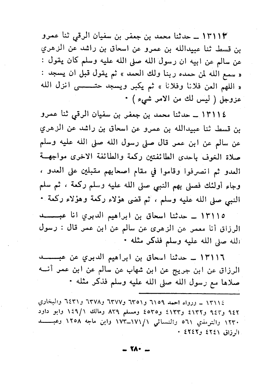 13114 - حَدَّثَنَا مُحَمَّدُ بْنُ جَعْفَرِ بْنِ سُفْيَانَ الرَّقِّيُّ، ثنا عَمْرُو بْنُ قُسْطٍ، ثنا عُبَيْدُ اللهِ بْنُ عَمْرٍو، عَنْ إِسْحَاقَ بْنِ رَاشِدٍ، عَنِ الزُّهْرِيِّ، عَنْ سَالِمٍ، عَنِ ابْنِ عُمَرَ، قَالَ: «§صَلَّى رَسُولُ اللهِ صَلَّى اللهُ عَلَيْهِ وَسَلَّمَ صَلَاةَ الْخَوْفِ بِإِحْدَى الطَّائِفَتَيْنِ رَكْعَةً، وَالطَّائِفَةُ الْأُخْرَى مُوَاجِهَةُ الْعَدُوِّ، ثُمَّ انْصَرَفُوا وَقَامُوا فِي مَقَامِ أَصْحَابِهِمْ مُقْبِلِينَ عَلَى الْعَدُوِّ، وَجَاءَ أُولَئِكَ فَصَلَّى بِهِمُ النَّبِيُّ صَلَّى اللهُ عَلَيْهِ وَسَلَّمَ رَكْعَةً، ثُمَّ سَلَّمَ النَّبِيُّ صَلَّى اللهُ عَلَيْهِ وَسَلَّمَ ثُمَّ قَضَى هَؤُلَاءِ رَكْعَةً وَهَؤُلَاءِ رَكْعَةً»