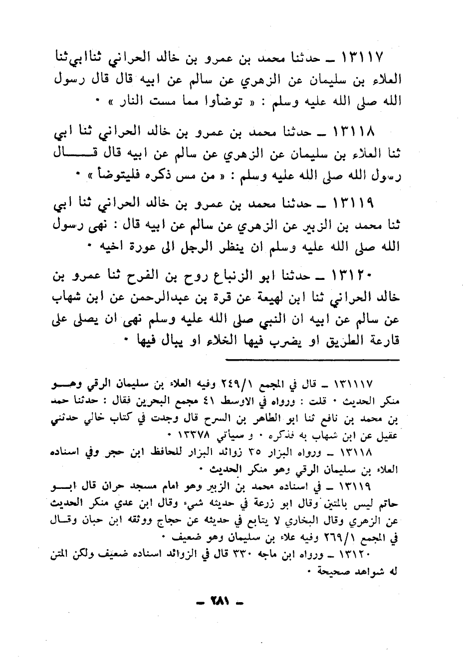 13118 - حَدَّثَنَا مُحَمَّدُ بْنُ عَمْرِو بْنِ خَالِدٍ الْحَرَّانِيُّ، ثنا أَبِي، ثنا الْعَلَاءُ بْنُ سُلَيْمَانَ، عَنِ الزُّهْرِيِّ، عَنْ سَالِمٍ، عَنْ أَبِيهِ، قَالَ: قَالَ رَسُولُ اللهِ صَلَّى اللهُ عَلَيْهِ وَسَلَّمَ: «§مَنْ مَسَّ ذَكَرَهُ فَلْيَتَوَضَّأْ»