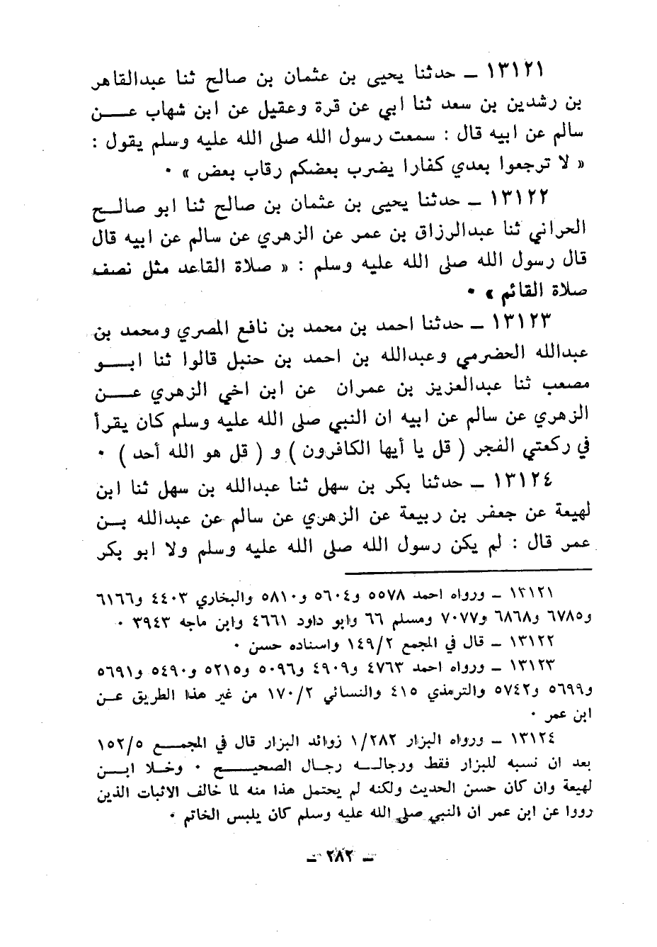 13121 - حَدَّثَنَا يَحْيَى بْنُ عُثْمَانَ بْنِ صَالِحٍ، ثنا عَبْدُ الْقَاهِرِ بْنُ رِشْدِينَ بْنِ سَعْدٍ، ثنا أَبِي، عَنْ قُرَّةَ، وَعُقَيْلٌ، عَنِ ابْنِ شِهَابٍ، عَنْ سَالِمٍ، عَنْ أَبِيهِ، قَالَ: سَمِعْتُ رَسُولَ اللهِ صَلَّى اللهُ عَلَيْهِ وَسَلَّمَ يَقُولُ: «§لَا تَرْجِعُوا بَعْدِي كُفَّارًا يَضْرِبُ بَعْضُكُمْ رِقَابَ بَعْضٍ»
