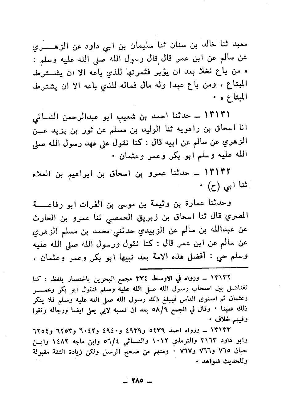 13132 - حَدَّثَنَا عَمْرُو بْنُ إِسْحَاقَ بْنِ إِبْرَاهِيمَ بْنِ الْعَلَاءِ، ثنا أَبِي، ح وَحَدَّثَنَا عُمَارَةُ بْنُ وَثِيمَةَ بْنِ مُوسَى بْنِ الْفُرَاتِ أَبُو رِفَاعَةَ الْمِصْرِيُّ، قَالَ: ثنا إِسْحَاقُ بْنُ زِبْرِيقَ الْحِمْصِيُّ، ثنا عَمْرُو بْنُ الْحَارِثِ، عَنْ عَبْدِ اللهِ بْنِ سَالِمٍ، عَنِ الزُّبَيْدِيِّ، حَدَّثَنِي مُحَمَّدُ بْنُ مُسْلِمٍ الزُّهْرِيُّ، عَنْ سَالِمٍ، عَنِ ابْنِ عُمَرَ، قَالَ: " §كُنَّا نَقُولُ وَرَسُولُ اللهِ صَلَّى اللهُ عَلَيْهِ وَسَلَّمَ حَيٌّ: أَفْضَلُ هَذِهِ الْأُمَّةِ بَعْدَ نَبِيِّهَا أَبُو بَكْرٍ، وَعُمَرُ، وَعُثْمَانُ، وَيَسْمَعُ ذَلِكَ النَّبِيُّ صَلَّى اللهُ عَلَيْهِ وَسَلَّمَ، وَلَا يُنْكِرُهُ "