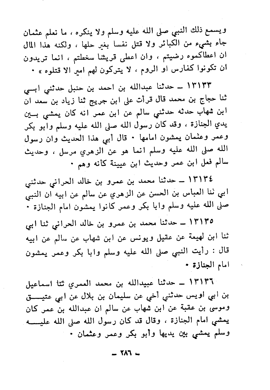 13133 - حَدَّثَنَا عَبْدُ اللهِ بْنُ أَحْمَدَ بْنِ حَنْبَلٍ، حَدَّثَنِي أَبِي، ثنا حَجَّاجُ بْنُ مُحَمَّدٍ، قَالَ: قَرَأْتُ عَلَى ابْنِ جُرَيْجٍ، ثنا زِيَادُ بْنُ سَعْدٍ أَنَّ ابْنَ شِهَابٍ حَدَّثَهُ، حَدَّثَنِي سَالِمٌ، عَنِ ابْنِ عُمَرَ أَنَّهُ: «§كَانَ يَمْشِي بَيْنَ يَدَيِ الْجِنَازَةِ وَقَدْ كَانَ رَسُولُ اللهِ صَلَّى اللهُ عَلَيْهِ وَسَلَّمَ، وَأَبُو بَكْرٍ، وَعُمَرُ وَعُثْمَانُ يَمْشُونَ أَمَامَهَا» ، «قَالَ أَبِي هَذَا الْحَدِيثَ» وَإِنَّ رَسُولَ اللهِ صَلَّى اللهُ عَلَيْهِ وَسَلَّمَ «إِنَّمَا هُوَ عَنِ الزُّهْرِيِّ مُرْسَلٌ، وَحَدِيثُ سَالِمٍ فَعَلَ ابْنُ عُمَرَ، وَحَدِيثُ ابْنُ عُيَيْنَةَ كَأَنَّهُ وَهِمَ»