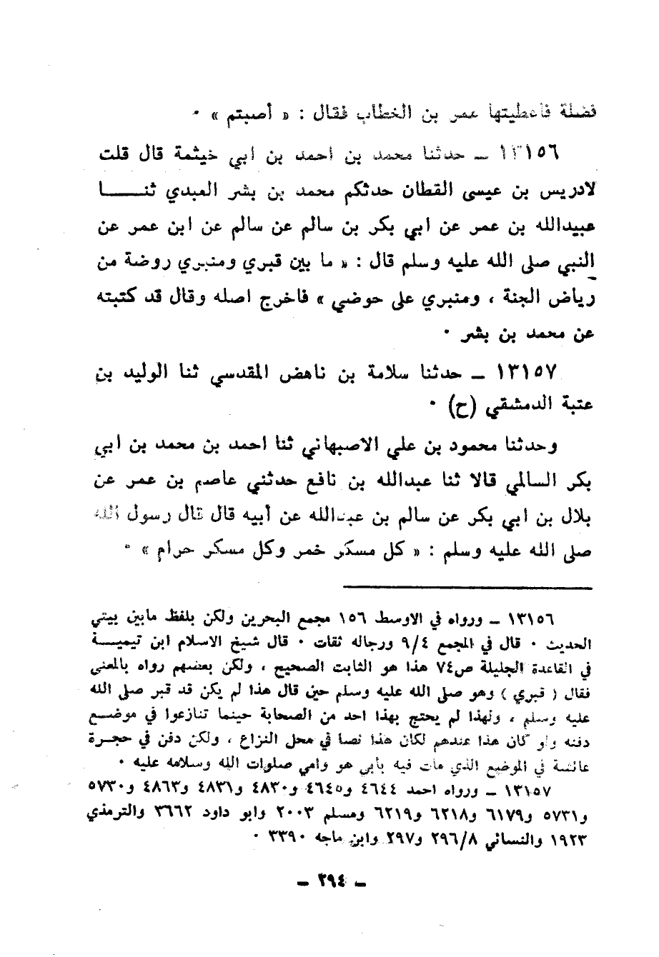 13156 - حَدَّثَنَا مُحَمَّدُ بْنُ أَحْمَدَ بْنِ أَبِي خَيْثَمَةَ، قَالَ: قُلْتُ لِإِدْرِيسَ بْنِ عِيسَى الْقَطَّانِ، حَدَّثَكُمْ مُحَمَّدُ بْنُ بِشْرٍ الْعَبْدِيُّ، ثنا عُبَيْدُ اللهِ بْنُ عُمَرَ عَنْ أَبِي بَكْرِ بْنِ سَالِمٍ، عَنْ سَالِمٍ، عَنِ ابْنِ عُمَرَ، عَنِ النَّبِيِّ صَلَّى اللهُ عَلَيْهِ وَسَلَّمَ قَالَ: «§مَا بَيْنَ قَبْرِي، وَمِنْبَرِي رَوْضَةٌ مِنْ رِيَاضِ الْجَنَّةِ، وَمِنْبَرِي عَلَى حَوْضِي» فَأَخْرَجَ أَصْلَهُ وَقَالَ: قَدْ كَتَبْتُهُ عَنْ مُحَمَّدِ بْنِ بِشْرٍ