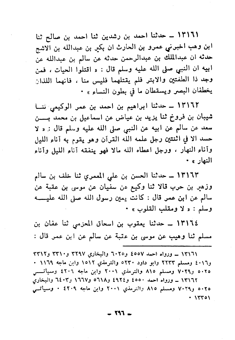 13161 - حَدَّثَنَا أَحْمَدُ بْنُ رِشْدِينَ، ثنا أَحْمَدُ بْنُ صَالِحٍ، ثنا ابْنُ وَهْبٍ، أَخْبَرَنِي عَمْرُو بْنُ الْحَارِثِ أَنَّ بُكَيْرَ بْنَ عَبْدِ اللهِ بْنِ الْأَشَجِّ، حَدَّثَهُ أَنَّ عَبْدَ الْمَلِكِ بْنَ عَبْدِ الرَّحْمَنِ، حَدَّثَهُ، عَنْ سَالِمِ بْنِ عَبْدِ اللهِ، عَنْ أَبِيهِ، أَنَّ النَّبِيَّ صَلَّى اللهُ عَلَيْهِ وَسَلَّمَ قَالَ: «§اقْتُلُوا الْحَيَّاتِ فَمَنْ وَجَدَ ذَا الطُّفْيَتَيْنِ، وَالْأَبْتَرَ فَلَمْ يَقْتُلْهُمَا، فَلَيْسَ مِنَّا، فَإِنَّهُمَا اللَّذَانِ يَخْطِفَانِ الْبَصَرَ، وَيُسْقِطَانِ مَا فِي بُطُونِ النِّسَاءِ»