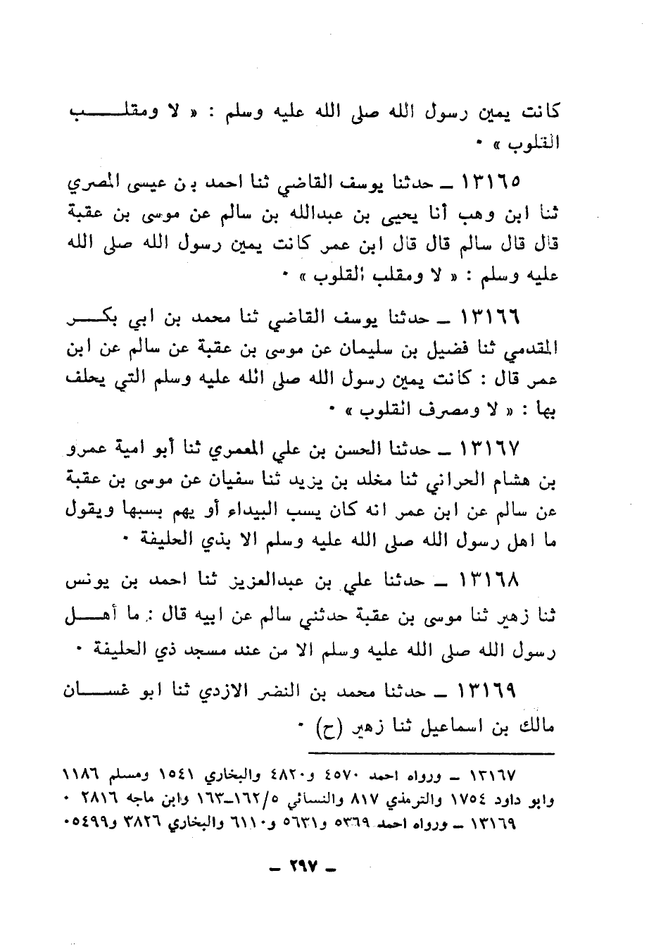 13165 - حَدَّثَنَا يُوسُفُ الْقَاضِي، ثنا أَحْمَدُ بْنُ عِيسَى الْمِصْرِيُّ، ثنا ابْنُ وَهْبٍ، أنا يَحْيَى بْنُ عَبْدِ اللهِ بْنِ سَالِمٍ، عَنْ مُوسَى بْنِ عُقْبَةَ، قَالَ: قَالَ سَالِمٌ: قَالَ: قَالَ ابْنُ عُمَرَ: كَانَتْ يَمِينُ رَسُولِ اللهِ صَلَّى اللهُ عَلَيْهِ وَسَلَّمَ: «§لَا وَمُقَلِّبِ الْقُلُوبِ»