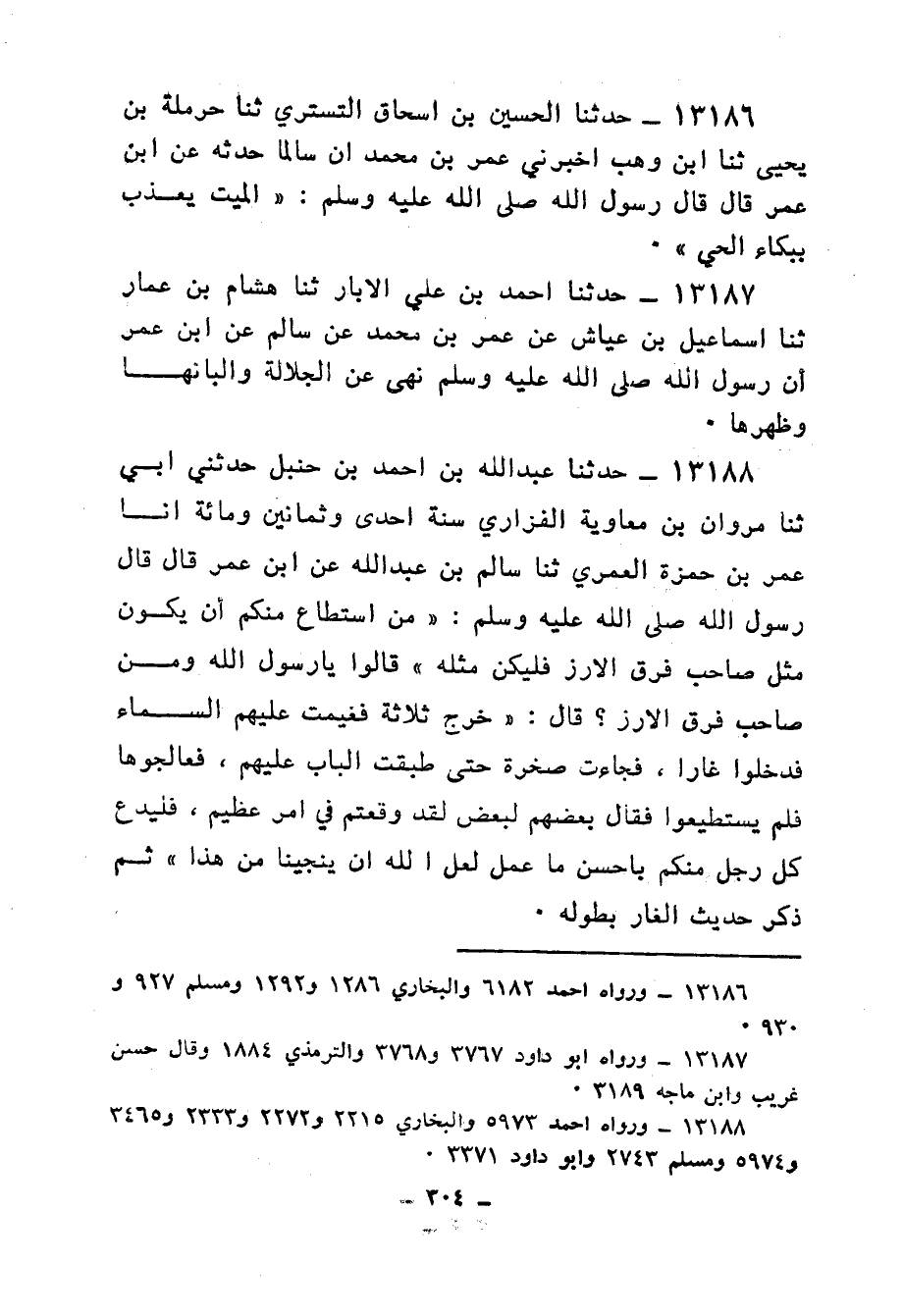 13188 - حَدَّثَنَا عَبْدُ اللهِ بْنُ أَحْمَدَ بْنِ حَنْبَلٍ، حَدَّثَنِي أَبِي، ثنا مَرْوَانُ بْنُ مُعَاوِيَةَ الْفَزَارِيُّ، سَنَةَ إِحْدَى وَثَمَانِينَ وَمِائَةٍ، أنا عُمَرُ بْنُ حَمْزَةَ الْعُمَرِيُّ، ثنا سَالِمُ بْنُ عَبْدِ اللهِ، عَنِ ابْنِ عُمَرَ، قَالَ: قَالَ رَسُولُ اللهِ صَلَّى اللهُ عَلَيْهِ وَسَلَّمَ: " مَنِ اسْتَطَاعَ مِنْكُمْ أَنْ يَكُونَ مِثْلَ صَاحِبِ فَرْقِ الْأَرُزِّ فَلْيَكُنْ مِثْلَهُ، قَالُوا: يَا رَسُولَ اللهِ وَمَنْ صَاحِبُ فَرْقِ الْأَرُزِّ؟ قَالَ: " §خَرَجَ ثَلَاثَةٌ فَغَيَّمَتْ عَلَيْهِمُ السَّمَاءُ فَدَخَلُوا غَارًا فَجَاءَتْ صَخْرَةٌ حَتَّى طَبَقَتِ الْبَابَ عَلَيْهِمْ فَعَالَجُوهَا فَلَمْ يَسْتَطِيعُوا، فَقَالَ بَعْضُهُمْ لِبَعْضٍ: لَقَدْ وَقَعْتُمْ فِي أَمْرٍ عَظِيمٍ فَلْيَدْعُ كُلُّ رَجُلٍ مِنْكُمْ بِأَحْسَنِ مَا عَمِلَ؛ لَعَلَّ اللهَ أَنْ يُنْجِيَنَا مِنْ هَذَا " ثُمَّ ذَكَرَ حَدِيثَ الْغَارِ بِطُولِهِ