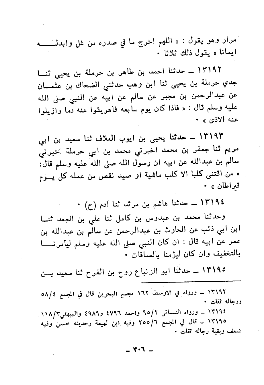 13192 - حَدَّثَنَا أَحْمَدُ بْنُ طَاهِرِ بْنِ حَرْمَلَةَ بْنِ يَحْيَى، ثنا جَدِّي حَرْمَلَةُ بْنُ يَحْيَى، ثنا ابْنُ وَهْبَ، حَدَّثَنِي الضَّحَّاكُ بْنُ عُثْمَانَ، عَنْ عَبْدِ الرَّحْمَنِ بْنِ مُجَبِّرٍ، عَنْ سَالِمٍ، عَنْ أَبِيهِ، عَنِ النَّبِيِّ صَلَّى اللهُ عَلَيْهِ وَسَلَّمَ قَالَ: «§فَإِذَا كَانَ يَوْمُ سَابِعِهِ فَأَهْرِيقُوا عَنْهُ دَمًا، وَأَزِيلُوا عَنْهُ الْأَذَى»