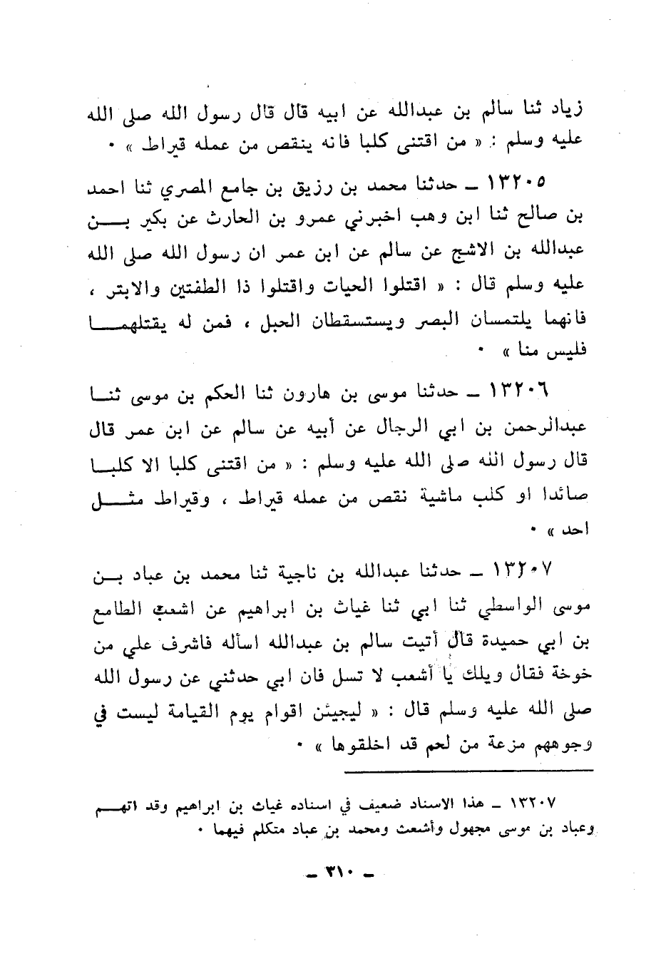 13206 - حَدَّثَنَا مُوسَى بْنُ هَارُونَ، ثنا الْحَكَمُ بْنُ مُوسَى، ثنا عَبْدُ الرَّحْمَنِ بْنُ أَبِي الرِّجَالِ، عَنْ أَبِيهِ، عَنْ سَالِمٍ، عَنِ ابْنِ عُمَرَ، قَالَ: قَالَ رَسُولُ اللهِ صَلَّى اللهُ عَلَيْهِ وَسَلَّمَ: «§مَنِ اقْتَنَى كَلْبًا إِلَّا كَلْبًا صَائِدًا أَوْ كَلْبَ مَاشِيَةٍ نَقَصَ مِنْ عَمَلِهِ قِيرَاطٌ، وَقَيْرَاطٌ مِثْلُ أُحُدٍ»