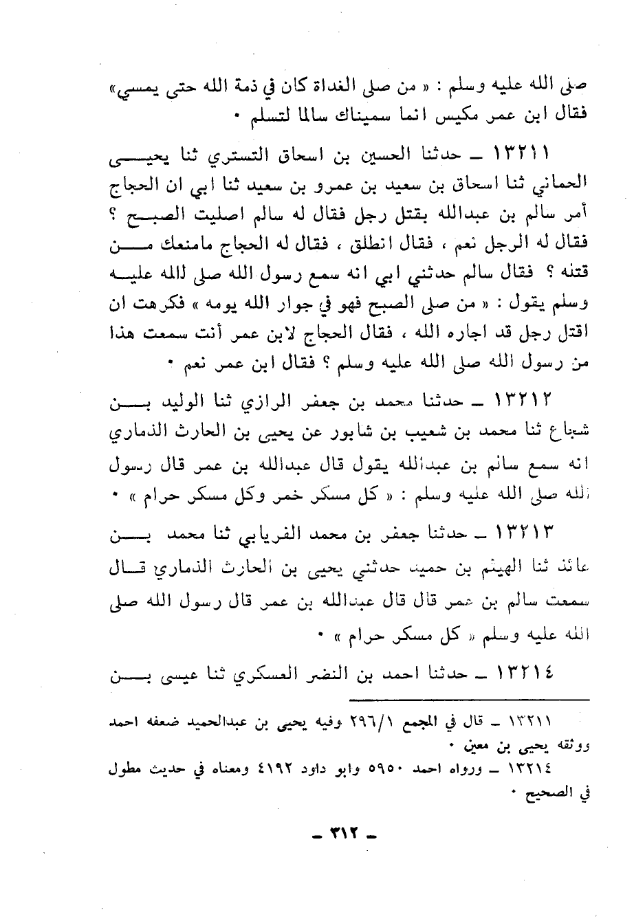 13211 - حَدَّثَنَا الْحُسَيْنُ بْنُ إِسْحَاقَ التُّسْتَرِيُّ، ثنا يَحْيَى الْحِمَّانِيُّ، ثنا إِسْحَاقُ بْنُ سَعِيدِ بْنِ عَمْرِو بْنِ سَعِيدٍ، ثنا أَبِي أَنَّ الْحَجَّاجَ أَمَرَ سَالِمَ بْنَ عَبْدِ اللهِ بِقَتْلِ رَجُلٍ فَقَالُ لَهُ سَالِمٌ: أَصَلَّيْتَ الصُّبْحَ؟ فَقَالَ لَهُ الرَّجُلُ: نَعَمْ، فَقَالَ: انْطَلِقْ فَقَالَ لَهُ الْحَجَّاجُ: مَا مَنَعَكَ مِنْ قَتْلِهِ؟ فَقَالَ سَالِمٌ: حَدَّثَنِي أَبِي أَنَّهُ سَمِعَ رَسُولَ اللهِ صَلَّى اللهُ عَلَيْهِ وَسَلَّمَ يَقُولُ: «§مَنْ صَلَّى الصُّبْحَ كَانَ فِي جِوَارِ اللهِ يَوْمَهُ» فَكَرِهْتُ أَنْ أَقْتُلَ رَجُلًا قَدْ أَجَارَهُ اللهُ فَقَالَ الْحَجَّاجُ لِابْنِ عُمَرَ: أَنْتَ سَمِعْتَ هَذَا مِنْ رَسُولِ اللهِ صَلَّى اللهُ عَلَيْهِ وَسَلَّمَ؟ فَقَالَ ابْنُ عُمَرَ: نَعَمْ