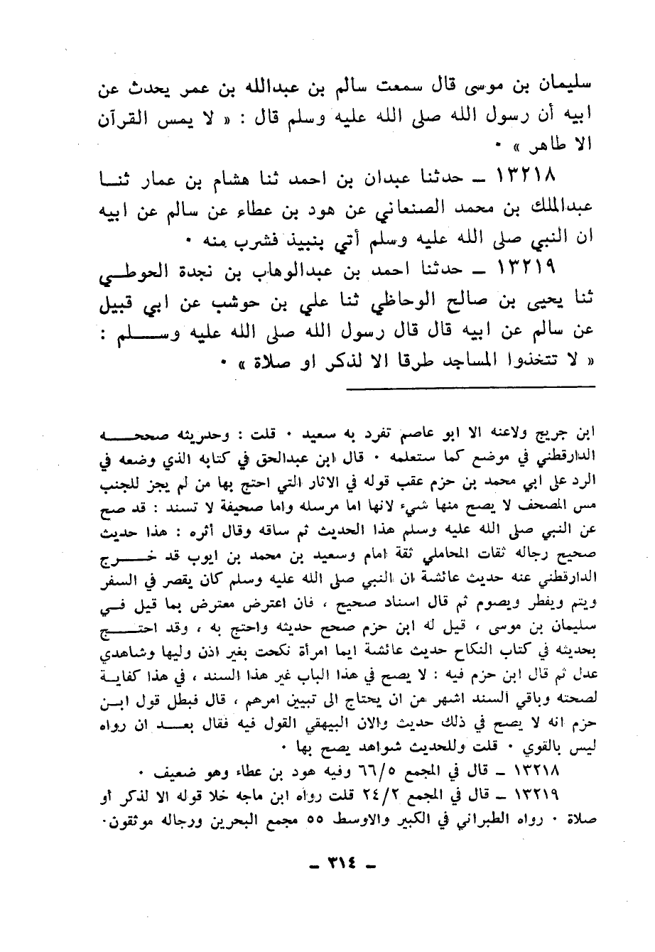 13219 - حَدَّثَنَا أَحْمَدُ بْنُ عَبْدِ الْوَهَّابِ بْنِ نَجْدَةَ الْحَوْطِيُّ، ثنا يَحْيَى بْنُ صَالِحٍ الْوُحَاظِيُّ، ثنا عَلِيُّ بْنُ حَوْشَبٍ، عَنْ أَبِي قَبِيلٍ، عَنْ سَالِمٍ، عَنْ أَبِيهِ، قَالَ: قَالَ رَسُولُ اللهِ صَلَّى اللهُ عَلَيْهِ وَسَلَّمَ: «§لَا تَتَّخِذُوا الْمَسَاجِدَ طُرُقًا إِلَّا لِذِكْرٍ أَوْ صَلَاةٍ»