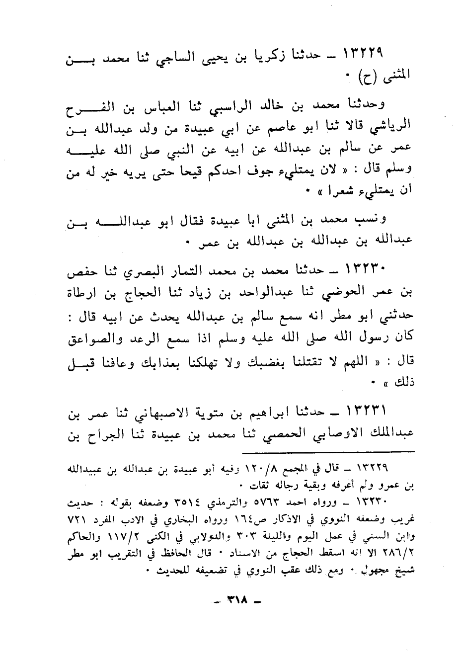 13229 - حَدَّثَنَا زَكَرِيَّا بْنُ يَحْيَى السَّاجِيُّ، ثنا مُحَمَّدُ بْنُ الْمُثَنَّى، ح وَحَدَّثَنَا مُحَمَّدُ بْنُ خَالِدٍ الرَّاسِبِيُّ، ثنا الْعَبَّاسُ بْنُ الْفَرَجِ الرِّيَاشِيُّ، قَالَا: ثنا أَبُو عَاصِمٍ، عَنْ أَبِي عُبَيْدَةَ مِنْ وَلَدِ عَبْدِ اللهِ بْنِ عُمَرَ، عَنْ سَالِمِ بْنِ عَبْدِ اللهِ، عَنْ أَبِيهِ، عَنِ النَّبِيِّ صَلَّى اللهُ عَلَيْهِ وَسَلَّمَ قَالَ: «§لَأَنْ يَمْتَلِئَ جَوْفُ أَحَدِكُمْ قَيْحًا حَتَّى يُرِيَهُ خَيْرٌ لَهُ مِنْ أَنْ يَمْتَلِئَ شِعْرًا» وَنَسَبَ مُحَمَّدُ بْنُ الْمُثَنَّى أَبَا عُبَيْدَةَ فَقَالَ: أَبُو عَبْدُ اللهِ بْنُ عَبْدِ اللهِ بْنِ عَبْدِ اللهِ بْنِ عَبْدِ اللهِ بْنِ عُمَرَ