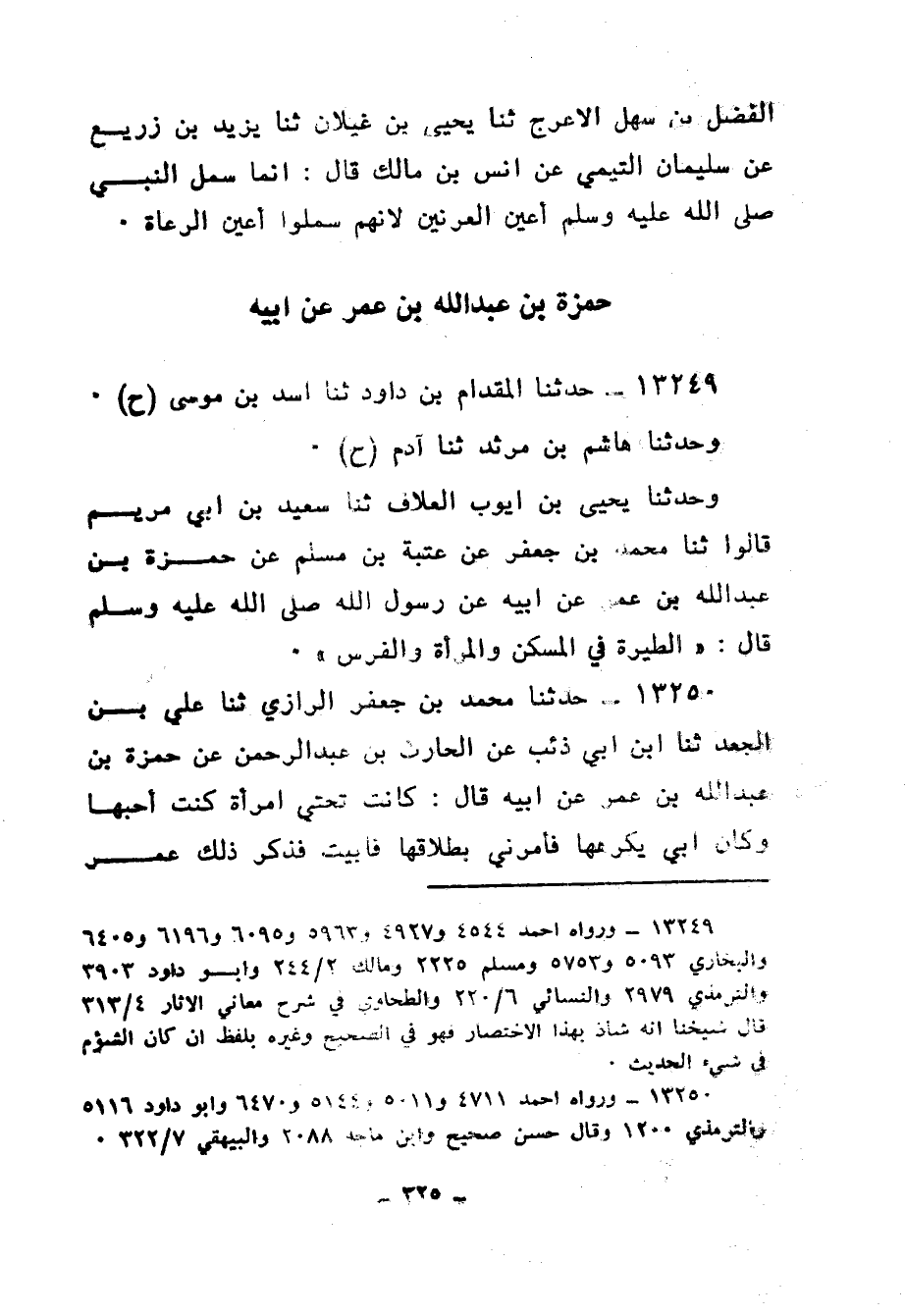 13249 - حَدَّثَنَا الْمِقْدَامُ بْنُ دَاوُدَ، ثنا أَسَدُ بْنُ مُوسَى، ح وَحَدَّثَنَا هَاشِمُ بْنُ مَرْثَدٍ، ثنا آدَمُ، ح وَحَدَّثَنَا يَحْيَى بْنُ أَيُّوبَ الْعَلَّافُ، ثنا سَعِيدُ بْنُ أَبِي مَرْيَمَ، قَالُوا: ثنا مُحَمَّدُ بْنُ جَعْفَرٍ، عَنْ عُتْبَةَ بْنِ مُسْلِمٍ، عَنْ حَمْزَةَ بْنِ عَبْدِ اللهِ بْنِ عُمَرَ، عَنْ أَبِيهِ، عَنْ رَسُولِ اللهِ صَلَّى اللهُ عَلَيْهِ وَسَلَّمَ قَالَ: «§الطِّيَرَةُ فِي الْمَسْكَنِ، وَالْمَرْأَةِ، وَالْفَرَسِ»