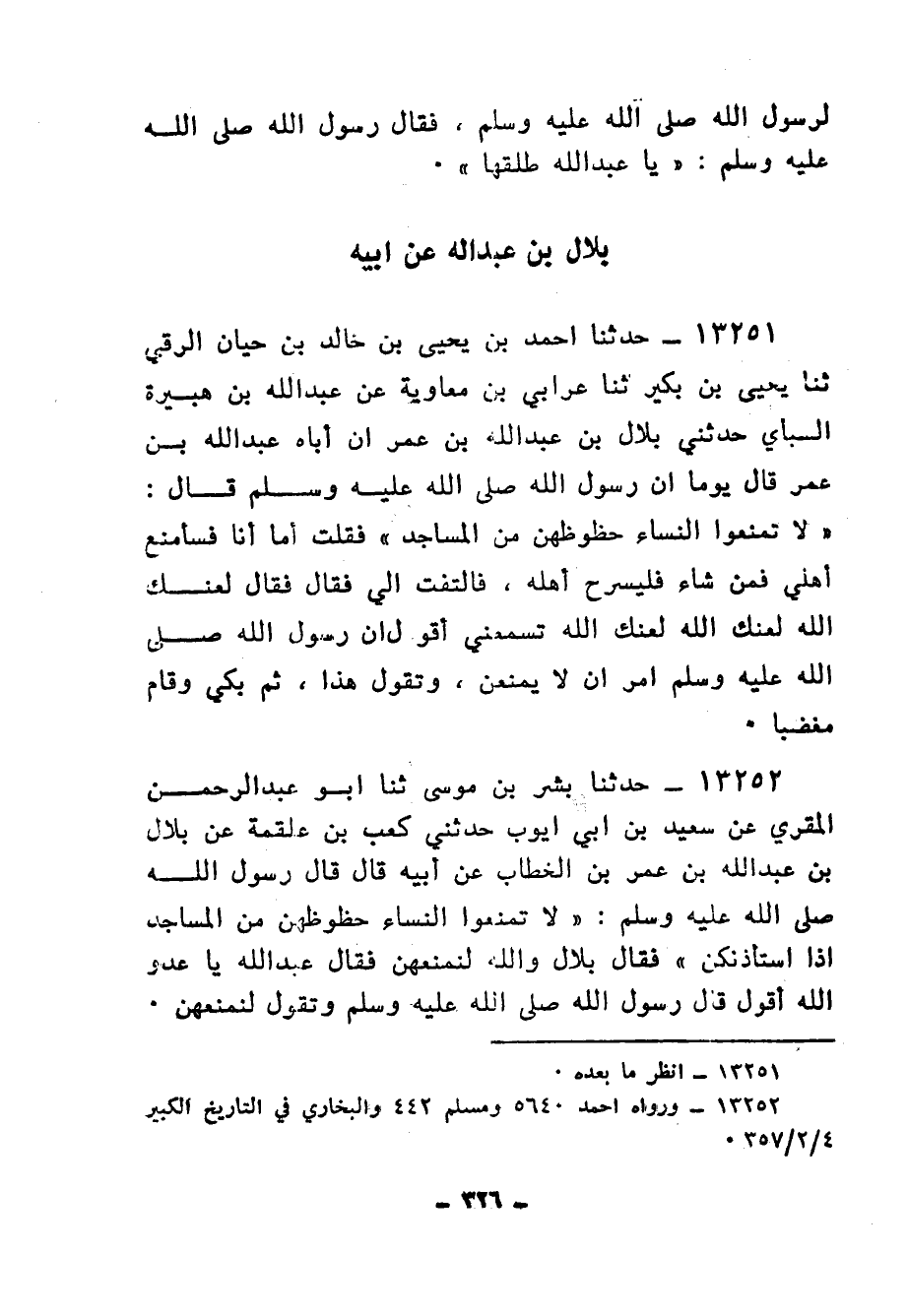 13251 - حَدَّثَنَا أَحْمَدُ بْنُ يَحْيَى بْنِ خَالِدِ بْنِ حَيَّانَ الرَّقِّيُّ، ثنا يَحْيَى بْنُ بُكَيْرٍ، ثنا عُرَابِيُّ بْنُ مُعَاوِيَةَ، عَنْ عَبْدِ اللهِ بْنِ هُبَيْرَةَ السِّبَائِيِّ، حَدَّثَنِي بِلَالُ بْنُ عَبْدِ اللهِ بْنِ عُمَرَ أَنَّ أَبَاهُ عَبْدَ اللهِ بْنَ عُمَرَ قَالَ يَوْمًا: إِنَّ رَسُولَ اللهِ صَلَّى اللهُ عَلَيْهِ وَسَلَّمَ قَالَ: «§لَا تَمْنَعُوا النِّسَاءَ حُظُوظَهُنَّ مِنَ الْمَسَاجِدِ» فَقُلْتُ: أَمَّا أَنَا فَسَأَمْنَعُ أَهْلِي، فَمَنْ شَاءَ فَلْيُسَرِّحْ أَهْلَهُ فَالْتَفَتَ إِلَيَّ، فَقَالَ: " لَعَنَكَ اللهُ، لَعَنَكَ اللهُ، لَعَنَكَ اللهُ، تَسْمَعُنِي أَقُولُ: إِنَّ رَسُولَ اللهِ صَلَّى اللهُ عَلَيْهِ وَسَلَّمَ أَمَرَ أَنْ لَا يُمْنَعْنَ، وَتَقُولُ: هَذَا , ثُمَّ بَكَى، وَقَامَ مُغْضَبًا "