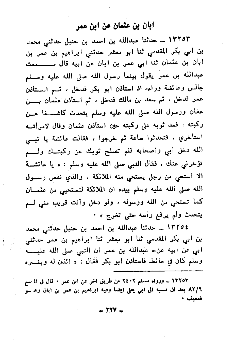 13253 - حَدَّثَنَا عَبْدُ اللهِ بْنُ أَحْمَدَ بْنِ حَنْبَلٍ، حَدَّثَني مُحَمَّدُ بْنُ أَبِي بَكْرٍ الْمُقَدَّمِيُّ، ثنا أَبُو مَعْشَرٍ، حَدَّثَنِي إِبْرَاهِيمُ بْنُ عُمَرَ بْنِ أَبَانَ بْنِ عُثْمَانَ، ثنا أَبِي عُمَرُ بْنُ أَبَانَ، عَنْ أَبِيهِ قَالَ: سَمِعْتُ عَبْدَ اللهِ بْنَ عُمَرَ، يَقُولُ: بَيْنَمَا رَسُولُ اللهِ صَلَّى اللهُ عَلَيْهِ وَسَلَّمَ جَالِسٌ وَعَائِشَةُ وَرَاءَهُ إِذِ اسْتَأْذَنَ أَبُو بَكْرٍ فَدَخَلَ , ثُمَّ اسْتَأْذَنَ عُمَرُ فَدَخَلَ , ثُمَّ سَعْدُ بْنُ مَالِكٍ فَدَخَلَ , ثُمَّ اسْتَأْذَنَ عُثْمَانُ بْنُ عَفَّانَ وَرَسُولُ اللهِ صَلَّى اللهُ عَلَيْهِ وَسَلَّمَ يَتَحَدَّثُ كَاشِفًا عَنْ رُكْبَتِهِ فَمَدَّ ثَوْبَهُ عَلَى رُكْبَتِهِ حِينَ اسْتَأْذَنَ عُثْمَانُ، وَقَالَ لِامْرَأَتِهِ اسْتَأْخِرِي: فَتَحَدَّثُوا سَاعَةً , ثُمَّ خَرَجُوا , فَقَالَتْ عَائِشَةُ: يَا نَبِيَّ اللهِ , دَخَلَ أَبِي وَأَصْحَابُهُ فَلَمْ تُصْلِحْ ثَوْبَكَ عَنْ رُكْبَتِكَ، وَلَمْ تُؤَخِّرْنِي عَنْكَ، فَقَالَ النَّبِيُّ صَلَّى اللهُ عَلَيْهِ وَسَلَّمَ: «يَا عَائِشَةُ أَلَا أَسْتَحْيِي مِنْ رَجُلٍ تَسْتَحْيِي مِنْهُ الْمَلَائِكَةُ، وَالَّذِي نَفْسُ رَسُولِ اللهِ صَلَّى اللهُ عَلَيْهِ وَسَلَّمَ بِيَدِهِ إِنَّ §الْمَلَائِكَةَ لَتَسْتَحْيِي مِنْ عُثْمَانَ كَمَا تَسْتَحْيِي مِنَ اللهِ وَرَسُولِهِ، وَلَوْ دَخَلَ وَأَنْتِ قَرِيبٌ مِنِّي لَمْ يَتَحَدَّثْ، وَلَمْ يَرْفَعْ رَأْسَهُ حَتَّى تخْرُجَ»