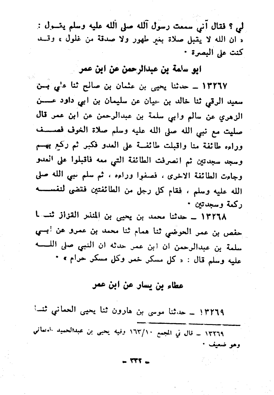 13267 - حَدَّثَنَا يَحْيَى بْنُ عُثْمَانَ بْنِ صَالِحٍ، ثنا عَلِيُّ بْنُ مَعْبَدٍ الرَّقِّيُّ، ثنا خَالِدُ بْنُ حَيَّانَ، عَنْ سُلَيْمَانَ بْنِ أَبِي دَاوُدَ، عَنِ الزُّهْرِيِّ، عَنْ سَالِمٍ وَأَبِي سَلَمَةَ بْنِ عَبْدِ الرَّحْمَنِ، عَنِ ابْنِ عُمَرَ، قَالَ: «§صَلَّيْتُ مَعَ نَبِيِّ اللهِ صَلَّى اللهُ عَلَيْهِ وَسَلَّمَ صَلَاةَ الْخَوْفِ فَصَفَّ وَرَاءَهُ طَائِفَةً مِنَّا، وَأَقْبَلَتْ طَائِفَةٌ عَلَى الْعَدُوِّ فَكَبَّرَ ثُمَّ رَكَعَ بِهِمْ وَسَجَدَ سَجْدَتَيْنِ، ثُمَّ انْصَرَفَتِ الطَّائِفَةُ الَّتِي مَعَهُ فَأَقْبَلُوا عَلَى الْعَدُوِّ وَجَاءَتِ الطَّائِفَةُ الْأُخْرَى فَصُفُّوا وَرَاءَهُ، ثُمَّ سَلَّمَ نَبِيُّ اللهِ صَلَّى اللهُ عَلَيْهِ وَسَلَّمَ، فَقَامَ كُلُّ رَجُلٍ مِنَ الطَّائِفَتَيْنِ فَقَضَى لِنَفْسِهِ رَكْعَةً وَسَجْدَتَيْنِ»