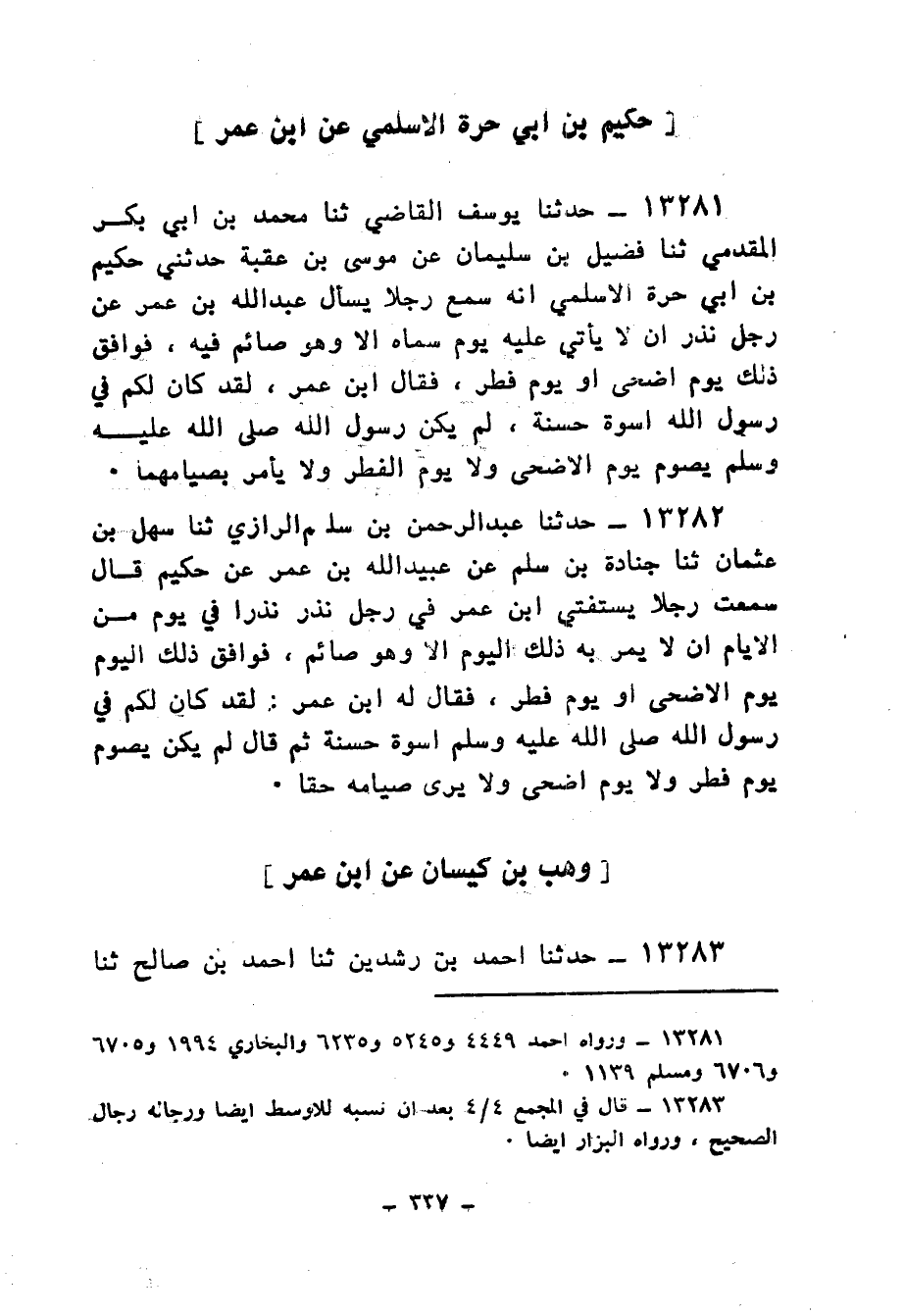 13281 - حَدَّثَنَا يُوسُفُ الْقَاضِي، ثنا مُحَمَّدُ بْنُ أَبِي بَكْرٍ الْمُقَدَّمِيُّ، ثنا فُضَيْلُ بْنُ سُلَيْمَانَ، عَنْ مُوسَى بْنِ عُقْبَةَ، حَدَّثَنِي حَكِيمُ بْنُ أَبِي حُرَّةَ الْأَسْلَمِيُّ، أَنَّهُ: سَمِعَ رَجُلًا يَسْأَلُ عَبْدَ اللهِ بْنَ عُمَرَ عَنْ رَجُلٍ، نَذَرَ أَنْ لَا يَأْتِيَ عَلَيْهِ يَوْمٌ سَمَّاهُ إِلَّا وَهُوَ صَائِمٌ فِيهِ، فَوَافَقَ ذَلِكَ يَوْمَ أَضْحًى أَوْ يَوْمَ فِطْرٍ، فَقَالَ ابْنُ عُمَرَ: لَقَدْ كَانَ لَكُمْ فِي رَسُولِ اللهِ، أُسْوَةٌ حَسَنَةٌ «§لَمْ يَكُنْ رَسُولُ اللهِ صَلَّى اللهُ عَلَيْهِ وَسَلَّمَ يَصُومُ يَوْمَ الْأَضْحَى، وَلَا يَوْمَ الْفِطْرِ، وَلَا يَأْمُرُ بِصِيَامِهِمَا»