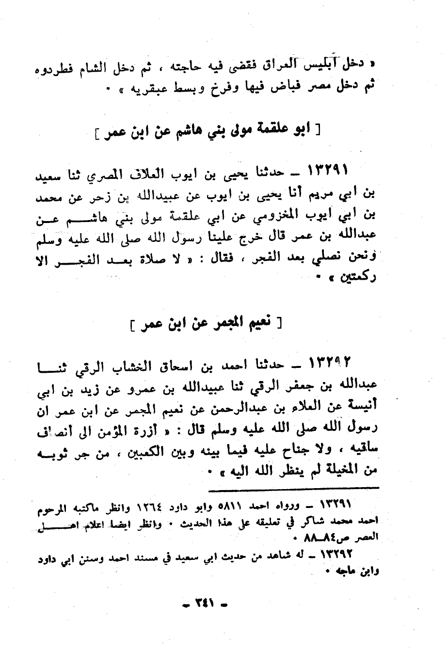 13291 - حَدَّثَنَا يَحْيَى بْنُ أَيُّوبَ الْعَلَّافُ الْمِصْرِيُّ، ثنا سَعِيدُ بْنُ أَبِي مَرْيَمَ، أنا يَحْيَى بْنُ أَيُّوبَ، عَنْ عُبَيْدِ اللهِ بْنِ زَحْرٍ، عَنْ مُحَمَّدِ بْنِ أَبِي أَيُّوبَ الْمَخْزُومِيِّ، عَنْ أَبِي عَلْقَمَةَ مَوْلَى بَنِي هَاشِمٍ، عَنْ عَبْدِ اللهِ بْنِ عُمَرَ، قَالَ: خَرَجَ عَلَيْنَا رَسُولُ اللهِ صَلَّى اللهُ عَلَيْهِ وَسَلَّمَ وَنَحْنُ نُصَلِّي بَعْدَ الْفَجْرِ فَقَالَ: «§لَا صَلَاةَ بَعْدَ الْفَجْرِ إِلَّا رَكْعَتَيْنِ»