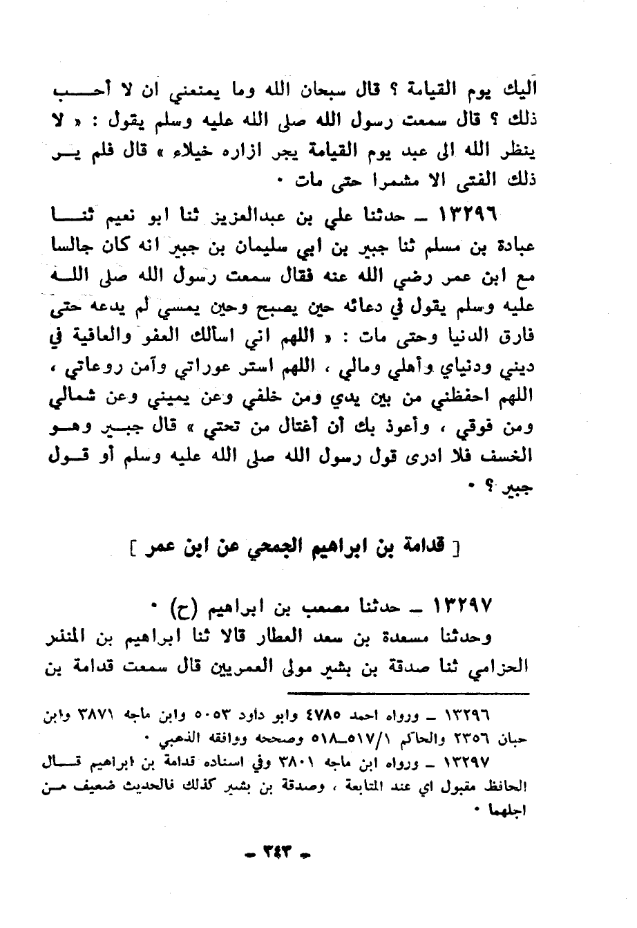 13296 - حَدَّثَنَا عَلِيُّ بْنُ عَبْدِ الْعَزِيزِ، ثنا أَبُو نُعَيْمٍ، ثنا عُبَادَةُ بْنُ مُسْلِمٍ، ثنا جُبَيْرُ بْنُ أَبِي سُلَيْمَانَ بْنِ جُبَيْرٍ، أَنَّهُ: كَانَ جَالِسًا مَعَ ابْنِ عُمَرَ رَضِيَ اللهُ عَنْهُ فَقَالَ: سَمِعْتُ رَسُولَ اللهِ صَلَّى اللهُ عَلَيْهِ وَسَلَّمَ يَقُولُ فِي دُعَائِهِ حِينَ يُصْبِحُ، وَحِينَ يُمْسِي لَمْ يَدَعْهُ حَتَّى فَارَقَ الدُّنْيَا، وَحَتَّى مَاتَ: «§اللهُمَّ إِنِّي أَسْأَلُكَ الْعَفْوَ، وَالْعَافِيَةَ فِي دِينِي وَدُنْيَايَ وَأَهِلِّي وَمَالِي، اللهُمَّ اسْتُرْ عَوْرَاتِي، وَآمِنْ رَوْعَاتِي، اللهُمَّ احْفَظْنِي مِنْ بَيْنِ يَدَيَّ، وَمِنْ خَلْفِي، وَعَنْ يَمِينِي، وَعَنْ شِمَالِي، وَمِنْ فَوْقِي، وَأَعُوذُ بِكَ أَنْ أُغْتَالَ مِنْ تَحْتِي» قَالَ جُبَيْرٌ: «وَهُوَ الْخَسْفُ» فَلَا أَدْرِي قَوْلَ رَسُولِ اللهِ صَلَّى اللهُ عَلَيْهِ وَسَلَّمَ أَوْ قَوْلَ جُبَيْرٍ؟ "