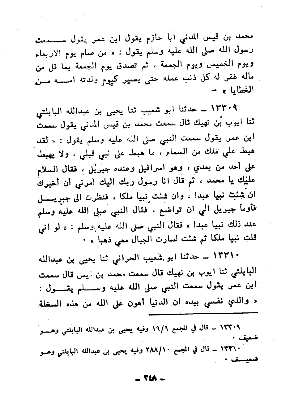 13309 - حَدَّثَنَا أَبُو شُعَيْبٍ، ثنا يَحْيَى بْنُ عَبْدِ اللهِ الْبَابْلُتِّيُّ، ثنا أَيُّوبُ بْنُ نَهِيكٍ، قَالَ: سَمِعْتُ مُحَمَّدَ بْنَ قَيْسٍ الْمَدَنِيَّ، يَقُولُ: سَمِعْتُ ابْنَ عُمَرَ، يَقُولُ: سَمِعْتُ النَّبِيَّ صَلَّى اللهُ عَلَيْهِ وَسَلَّمَ يَقُولُ: " لَقَدْ هَبَطَ عَلَيَّ مَلَكٌ مِنَ السَّمَاءِ مَا هَبَطَ عَلَى نَبِيٍّ قَبْلِي، وَلَا يَهْبِطُ عَلَى أَحَدٍ مِنْ بَعْدِي، وَهُوَ إِسْرَافِيلُ وَعِنْدَهُ جِبْرِيلُ فَقَالَ: السَّلَامُ عَلَيْكَ يَا مُحَمَّدُ، ثُمَّ قَالَ: أَنَا رَسُولُ رَبِّكِ إِلَيْكَ أَمَرَنِي أَنْ أُخْبِرَكَ إِنْ شِئْتَ نَبِيًّا عَبْدًا، وَإِنْ شِئْتَ نَبِيًّا مَلَكًا، فَنَظَرْتُ إِلَى جِبْرِيلَ فَأَوْمَأَ جِبْرِيلُ إِلَيَّ أَنْ تَوَاضَعْ، فَقَالَ النَّبِيُّ صَلَّى اللهُ عَلَيْهِ وَسَلَّمَ عِنْدَ ذَلِكَ: «نَبِيًّا عَبْدًا» فَقَالَ النَّبِيُّ صَلَّى اللهُ عَلَيْهِ وَسَلَّمَ: «§لَوْ أَنِّي قُلْتُ نَبِيًّا مَلَكًا، ثُمَّ شِئْتُ لَسَارَتِ الْجِبَالُ مَعِيَ ذَهَبًا»
