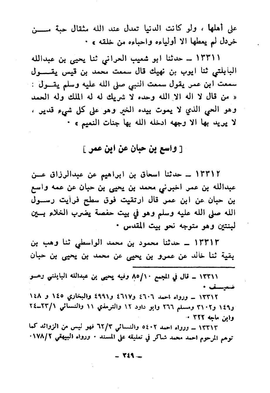 13311 - حَدَّثَنَا أَبُو شُعَيْبٍ الْحَرَّانِيُّ، ثنا يَحْيَى بْنُ عَبْدِ اللهِ الْبَابْلُتِّيُّ، ثنا أَيُّوبُ بْنُ نَهِيكٍ، قَالَ: سَمِعْتُ مُحَمَّدَ بْنَ قَيْسٍ، يَقُولُ: سَمِعْتُ ابْنَ عُمَرَ، يَقُولُ: سمعْتُ النَّبِيَّ صَلَّى اللهُ عَلَيْهِ وَسَلَّمَ يَقُولُ: " مَنْ قَالَ: §لَا إِلَهَ إِلَّا اللهُ وَحْدَهُ لَا شَرِيكَ لَهُ , لَهُ الْمُلْكُ، وَلَهُ الْحَمْدُ، وَهُوَ الْحَيُّ الَّذِي لَا يَمُوتُ بِيَدِهِ الْخَيْرُ، وَهُوَ عَلَى كُلِّ شَيْءٍ قَدِيرٌ، لَا يُرِيدُ بِهَا إِلَّا وَجْهَهُ أَدْخَلَهُ اللهُ بِهَا جَنَّاتِ النَّعِيمِ "